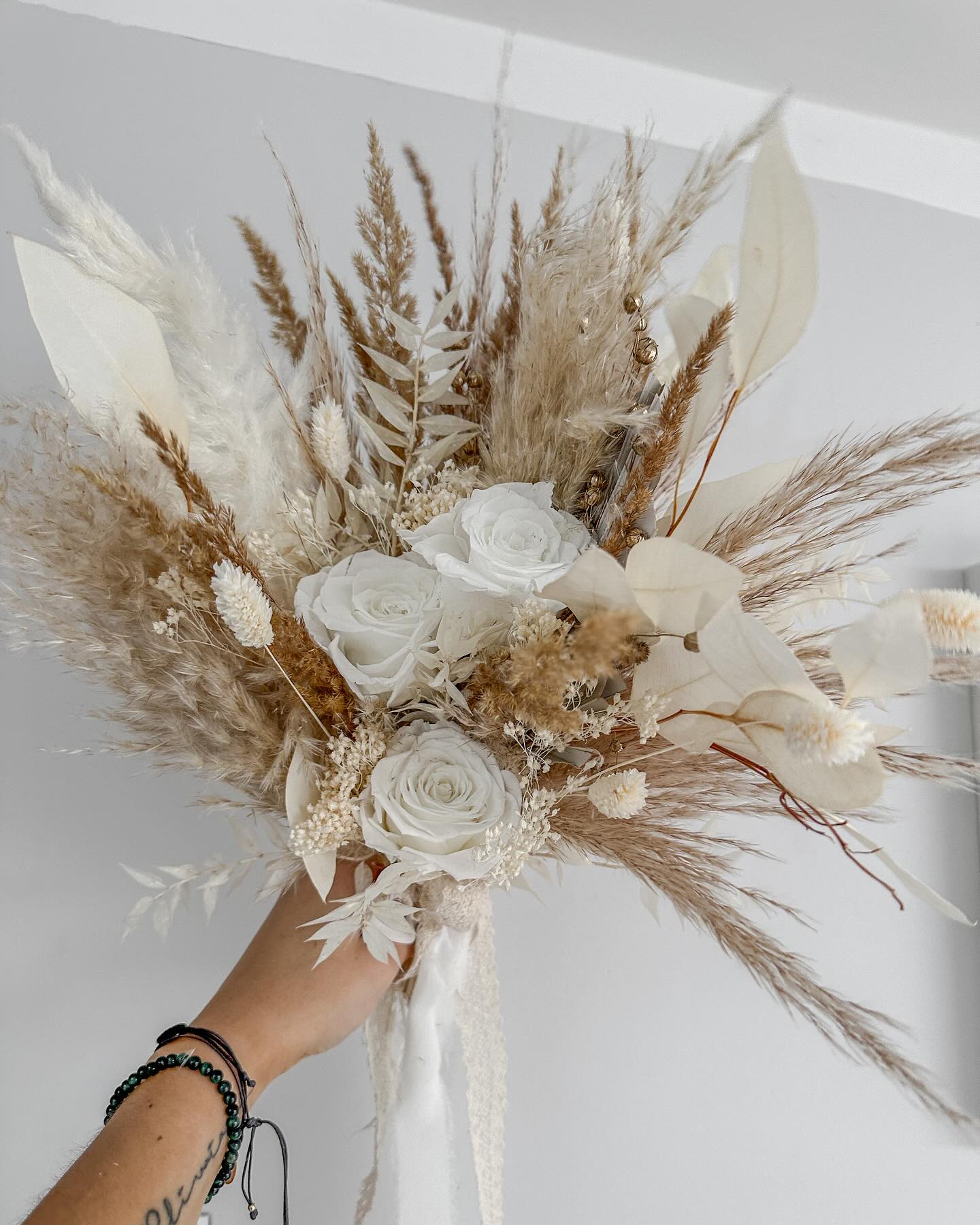 Bukiet boho z wiecznymi różami, kwiaty żywe poddane procesowi stabilizacji czyli wyparcia wody dzięki czemu zachowują świeżość do dwóch lub więcej lat.