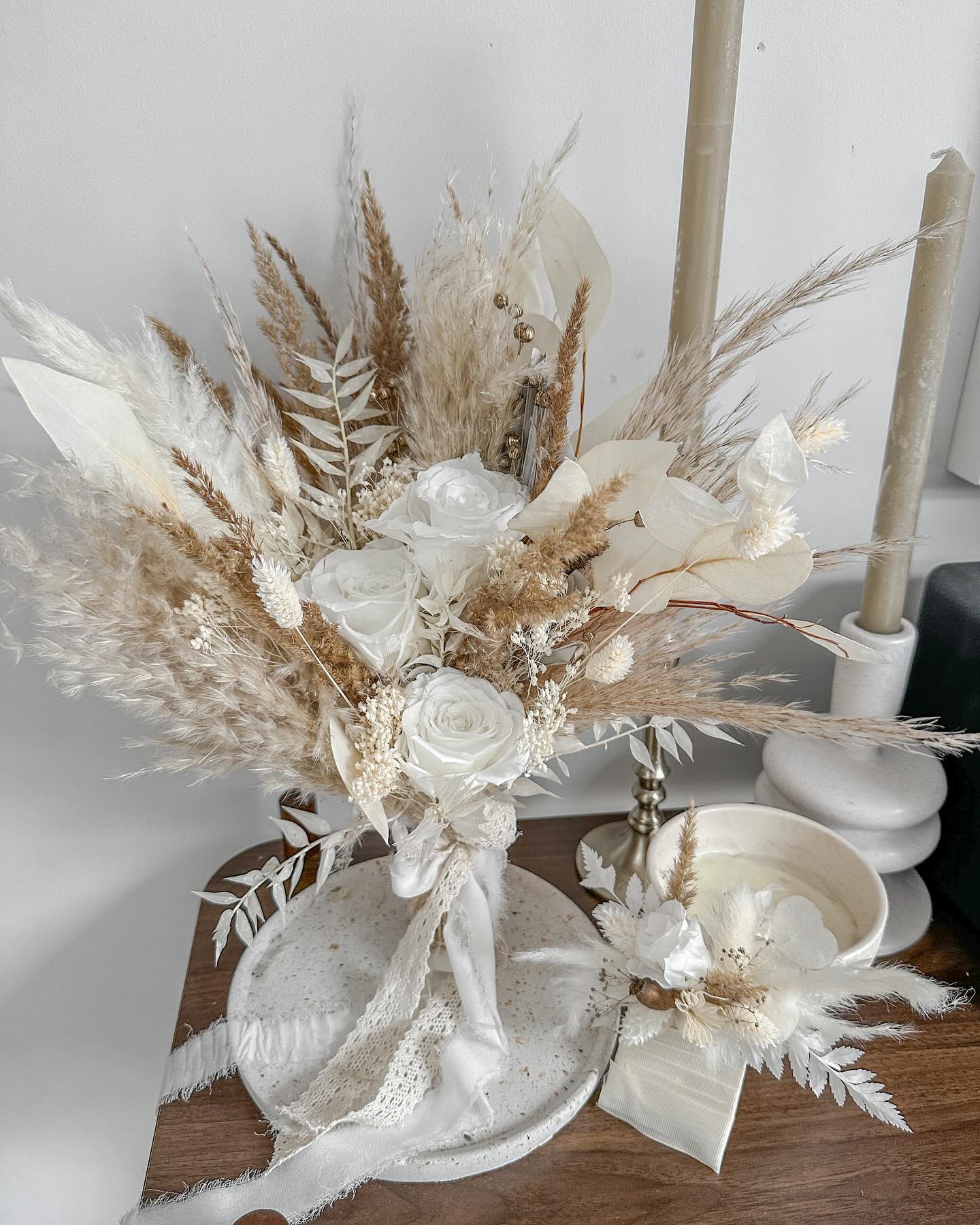 Suszone dodatki i trawa pampasowa tworzy bardzo lekką i subtelną kompozycję.
