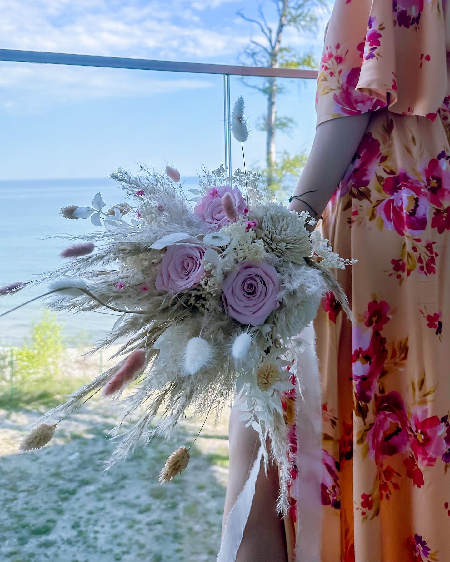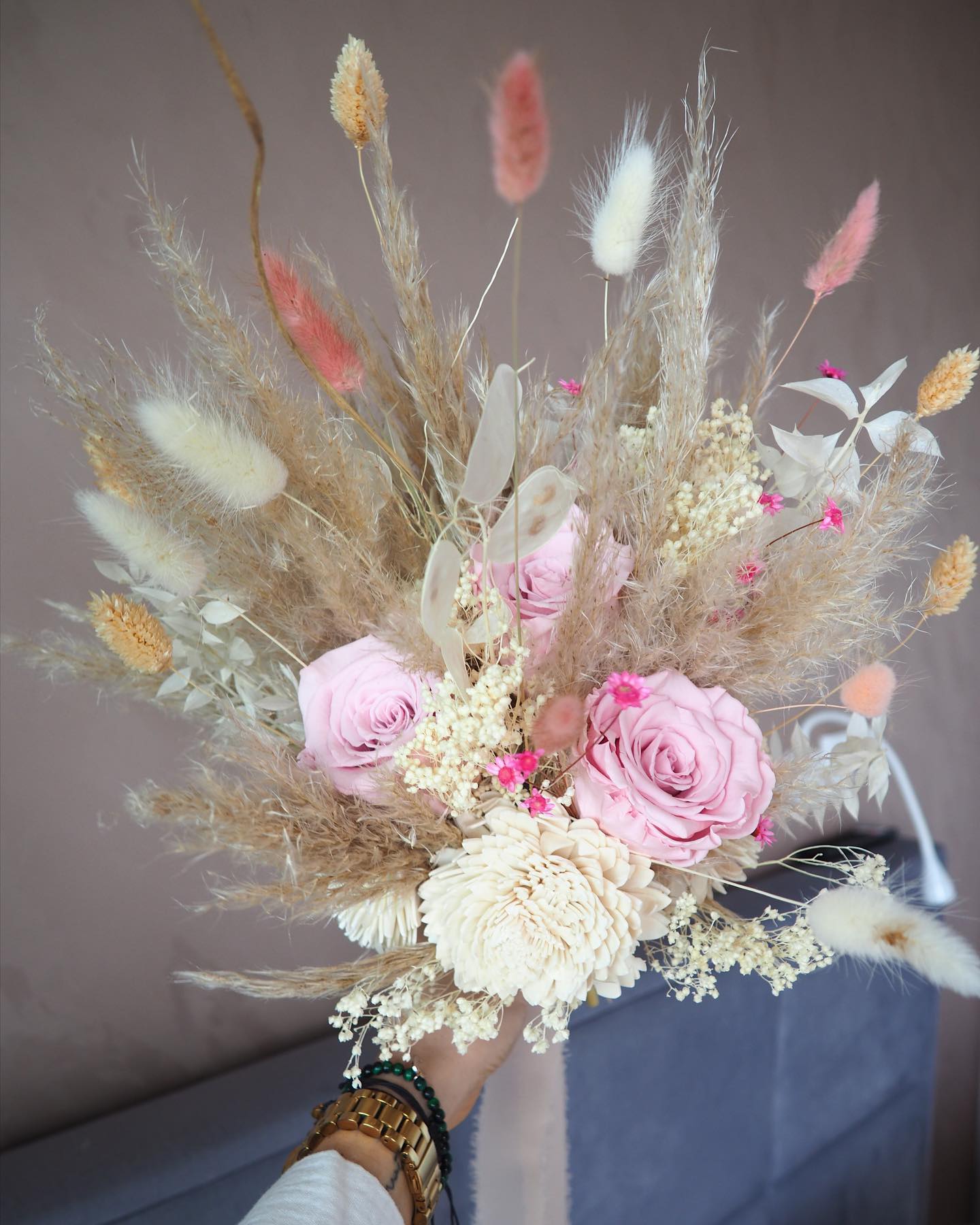 Suszone dodatki i trawa pampasowa tworzy bardzo lekką i subtelną kompozycję.