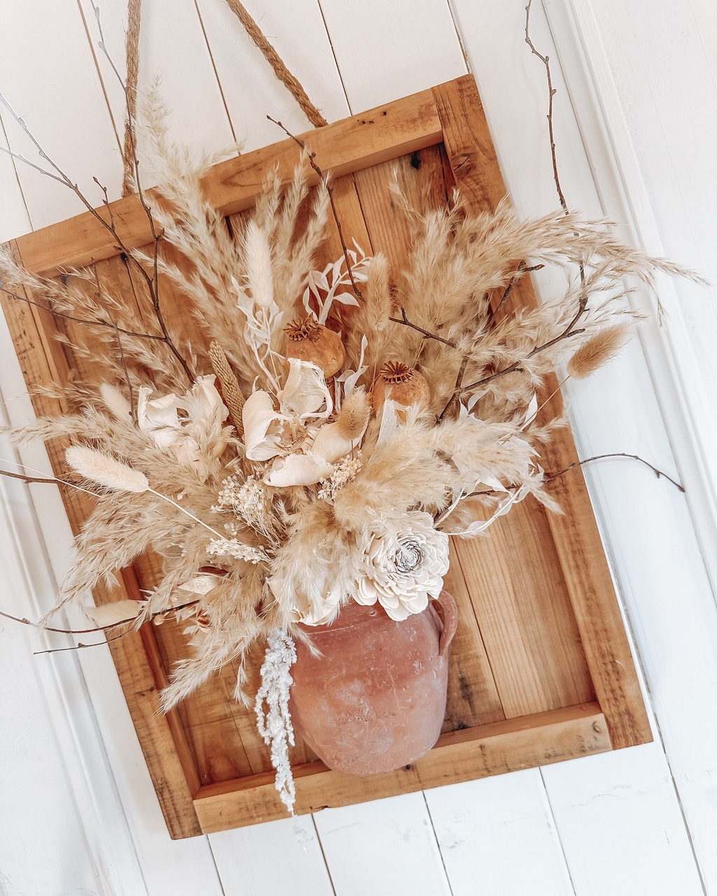 Dekoracja obraz 3D z bukietem suszonym w glinianym naczyniu.