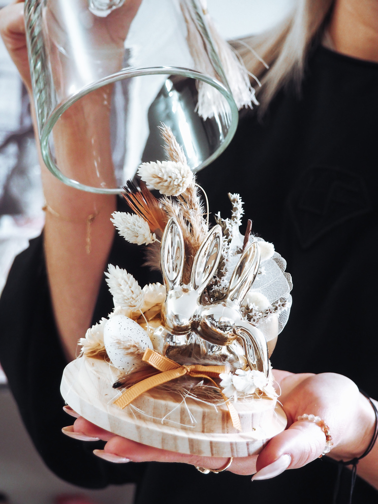 Złote ceramiczne całujące się króliczki stanowią centrum całej dekoracji.