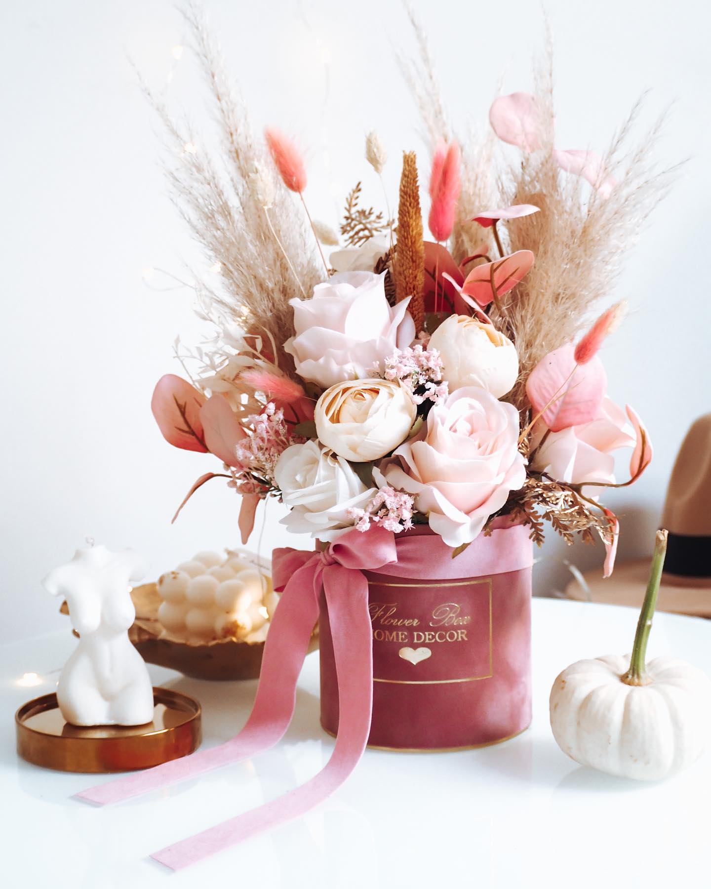 Flower Box wykonany ręcznie z dbałością o każdy szczegół z miękkiego weluru z pięknie wyeksponowanym logo Flower Box Home Decor.