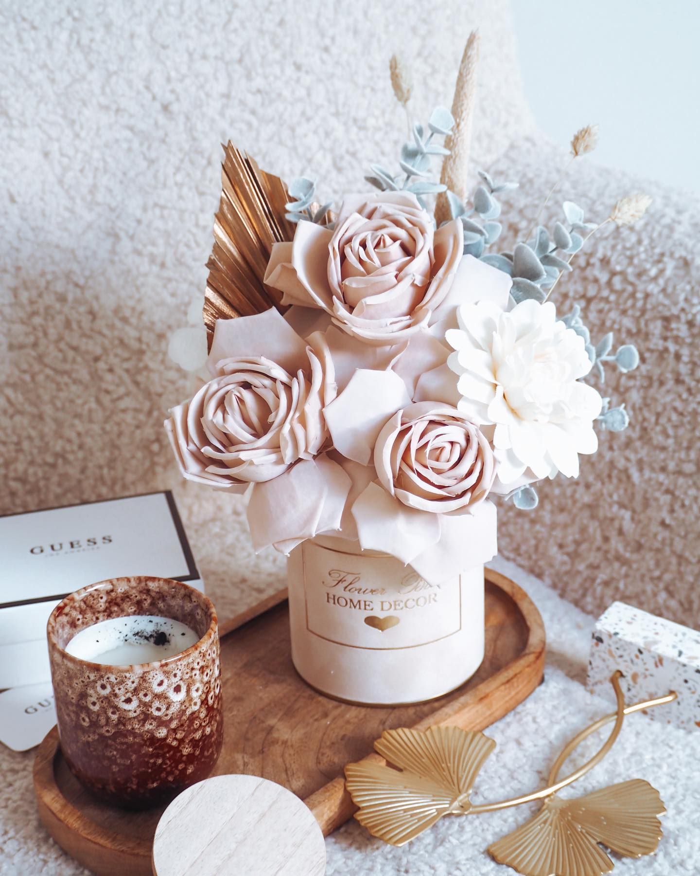Flower Box wykonany ręcznie z dbałością o każdy szczegół z miękkiego weluru z pięknie wyeksponowanym logo Flower Box Home Decor.