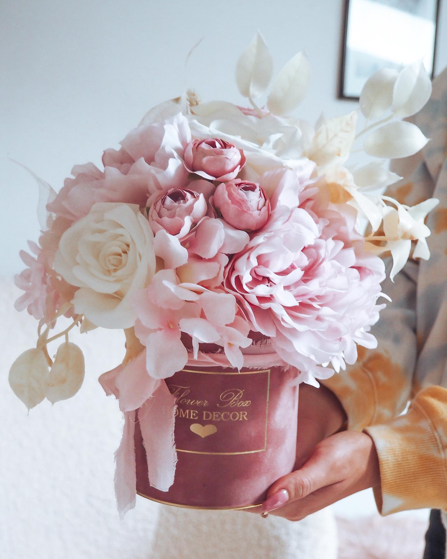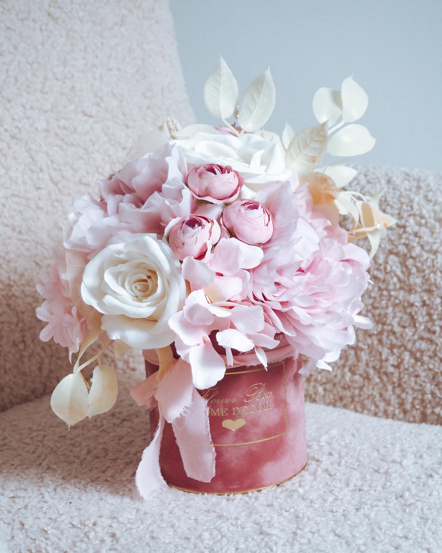 Flower Box wykonany ręcznie z dbałością o każdy szczegół z miękkiego weluru z pięknie wyeksponowanym logo Flower Box Home Decor.