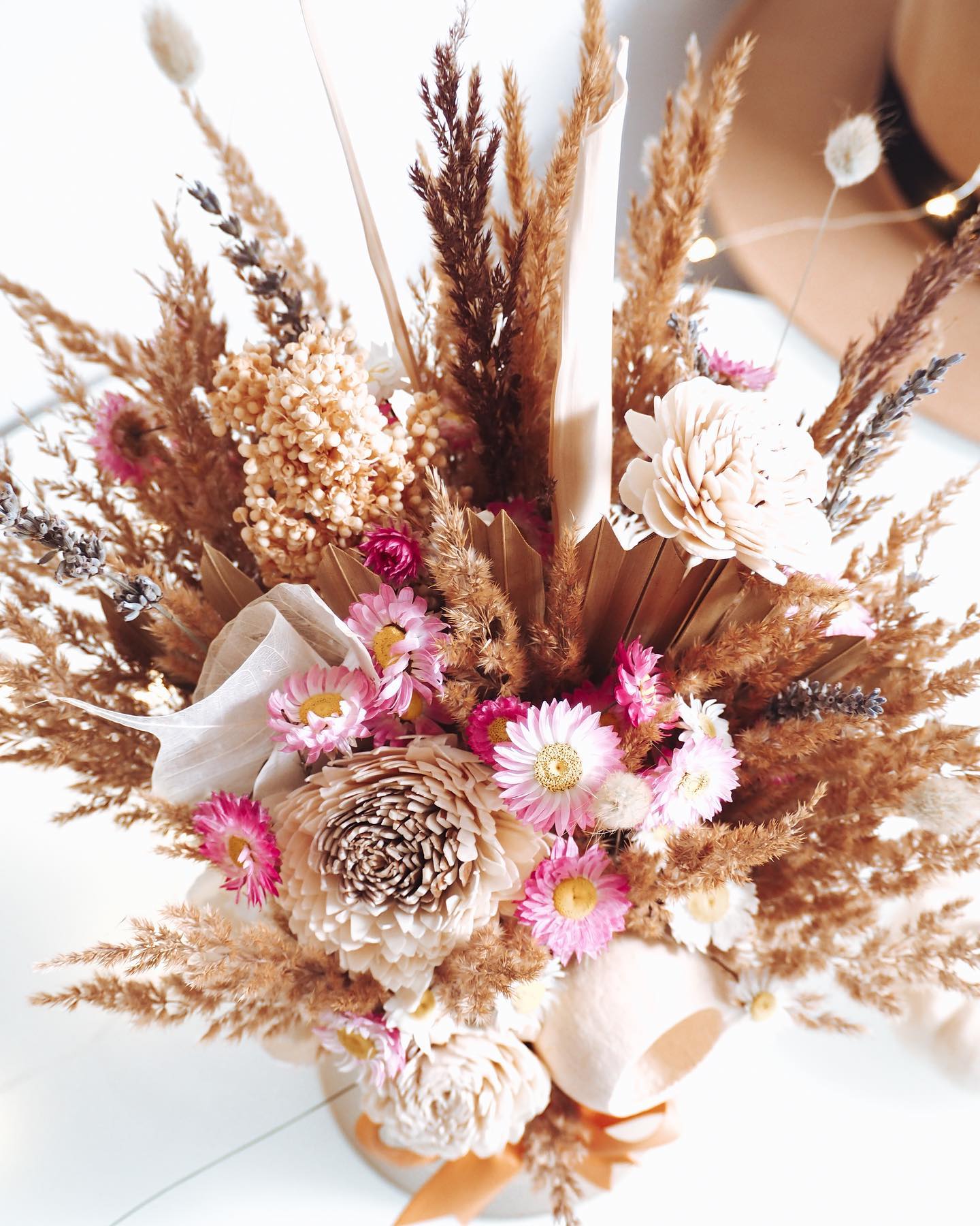 Kompozycja w całości naturalna, suszone trawy pampasowe oraz polne, rumianek, lawenda, kwiaty sholi.