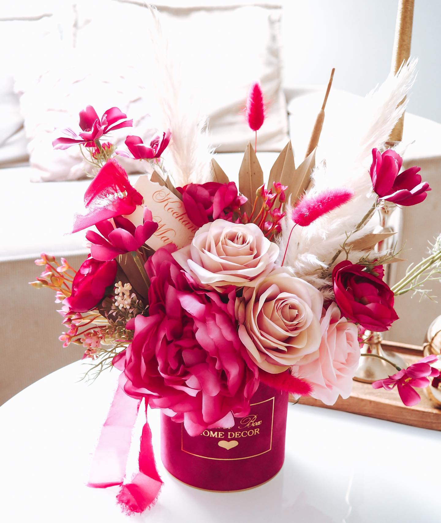 Flower Box wykonany ręcznie z dbałością o każdy szczegół z miękkiego weluru z pięknie wyeksponowanym logo Flower Box Home Decor, rozmiar pudełka 12 cm średnicy - 13 cm wysokości.