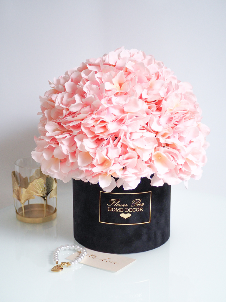 Kwiaty jedwabne hortensje w kolorze różu, bardzo kobiece połączenie różu i mocnej czerni.