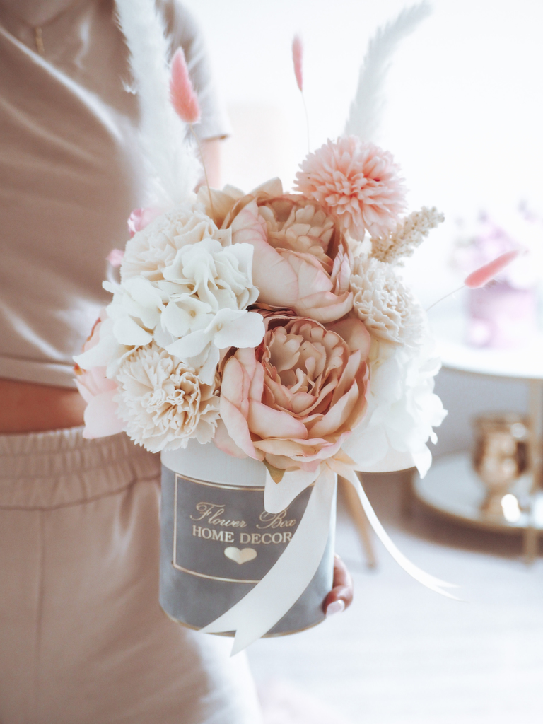 Flower Box wykonany ręcznie z dbałością o każdy szczegół z miękkiego weluru z pięknie wyeksponowanym logo Flower Box Home Decor.