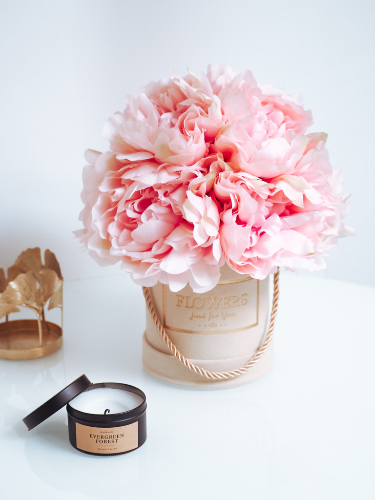 Kwiaty jedwabne piwonie w kremowym welurowym pudełku, bardzo kobiece połączenie.