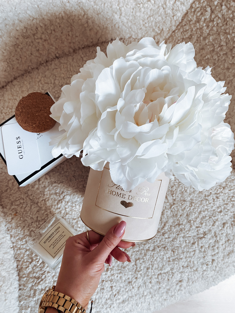 Kwiaty jedwabne piwonie w kremowym welurowym pudełku, bardzo kobiece połączenie.