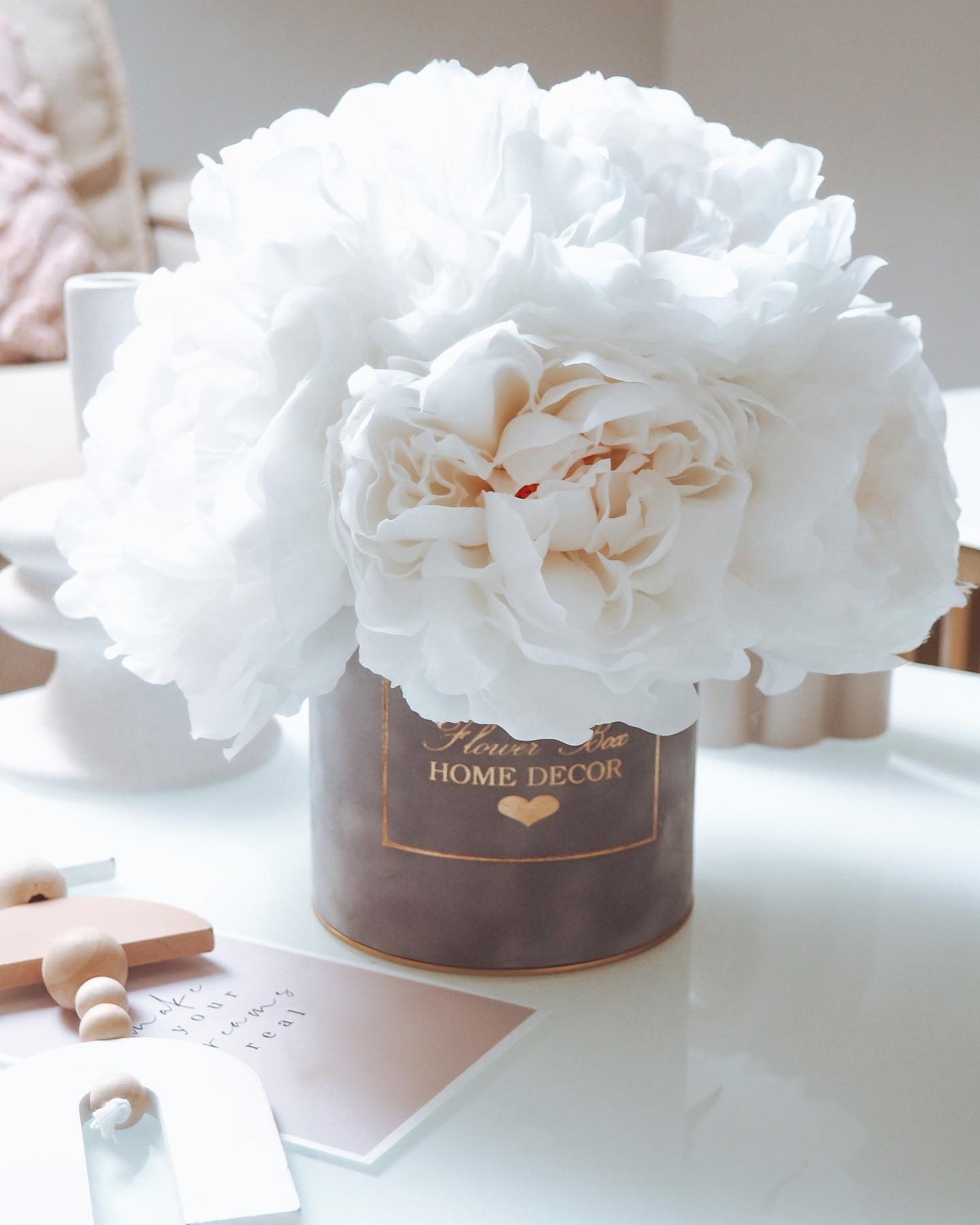 Kwiaty jedwabne piwonie w kolorze śmietankowym i szarym welurowym pudełku, bardzo kobiece połączenie.