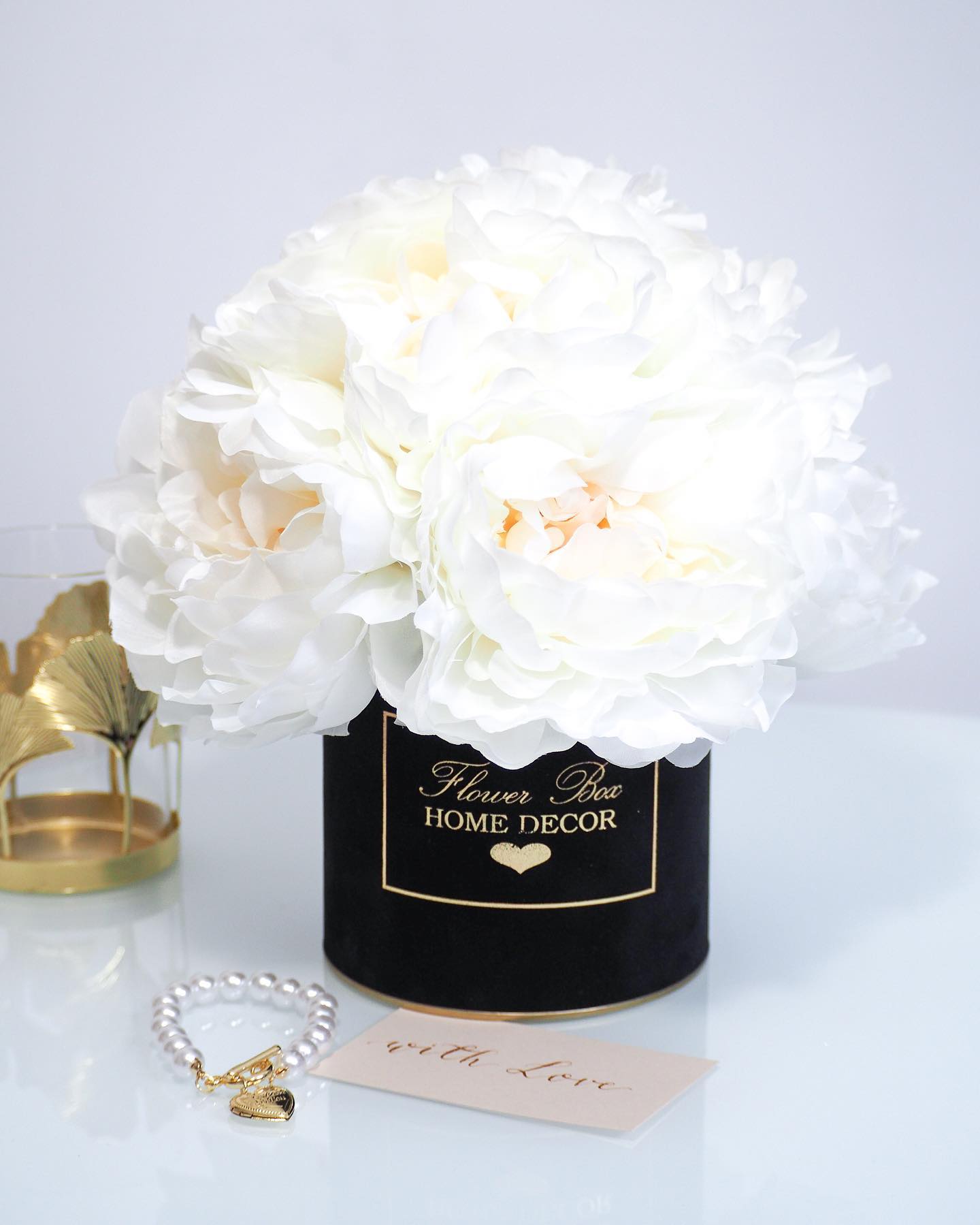 Flower Box wykonany ręcznie z dbałością o każdy szczegół z miękkiego weluru z pięknie wyeksponowanym logo Flower Box Home Decor, rozmiar pudełka 12 cm średnicy - 13 cm wysokości.