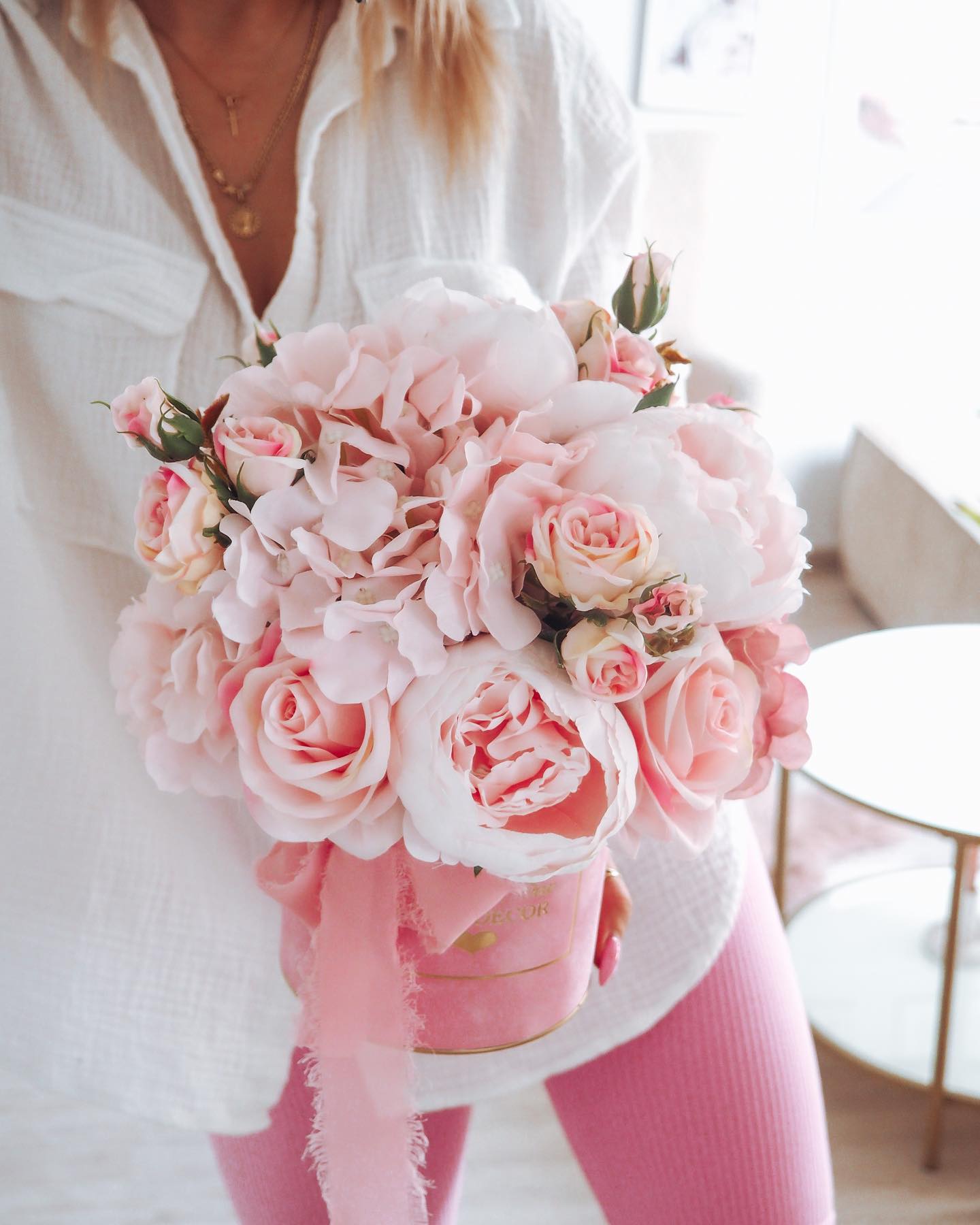 Kwiaty jedwabne piwonie, róże oraz hortensje w pudrowo różowym welurowym pudełku, bardzo kobiece połączenie.