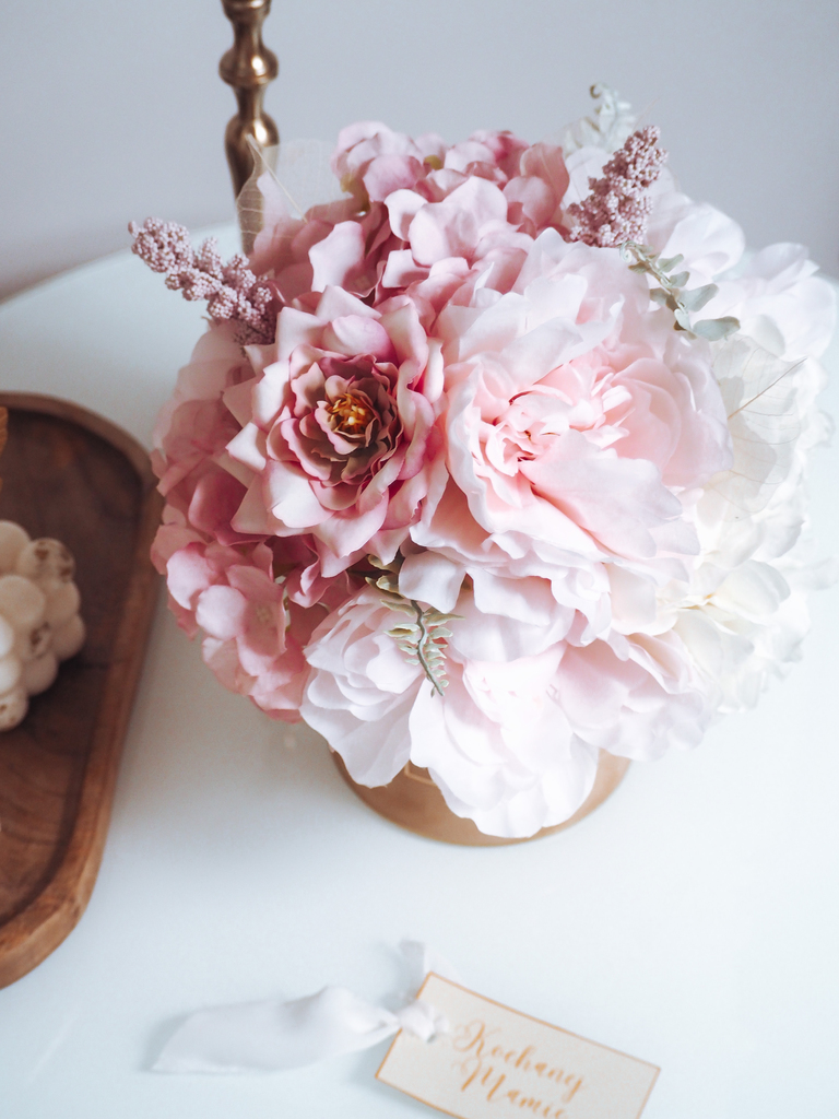Kwiaty jedwabne piwonie oraz dalia w towarzystwie hortensji, bardzo kobiece połączenie.