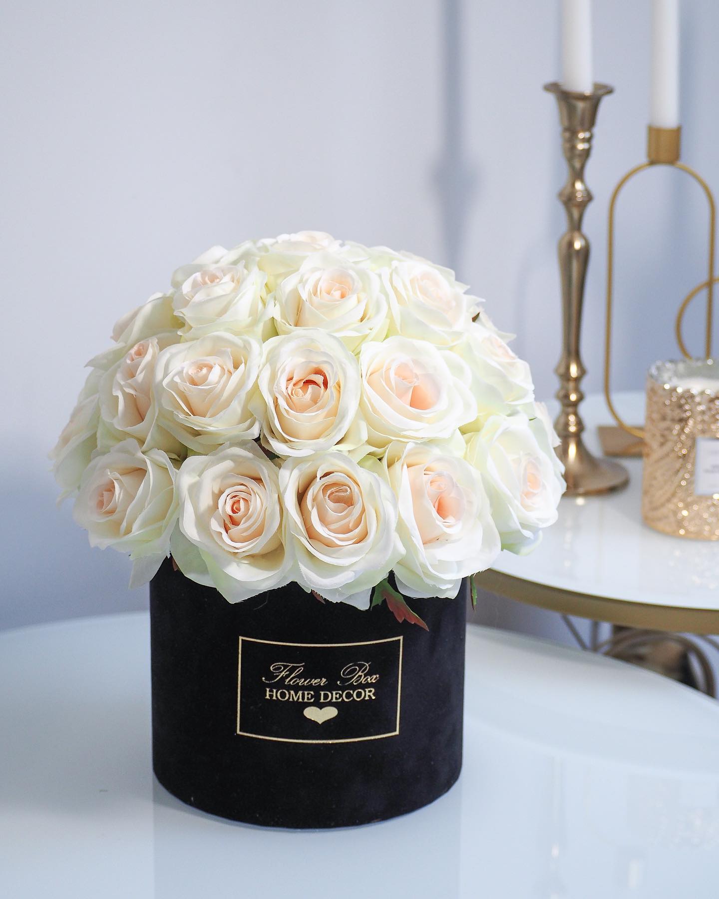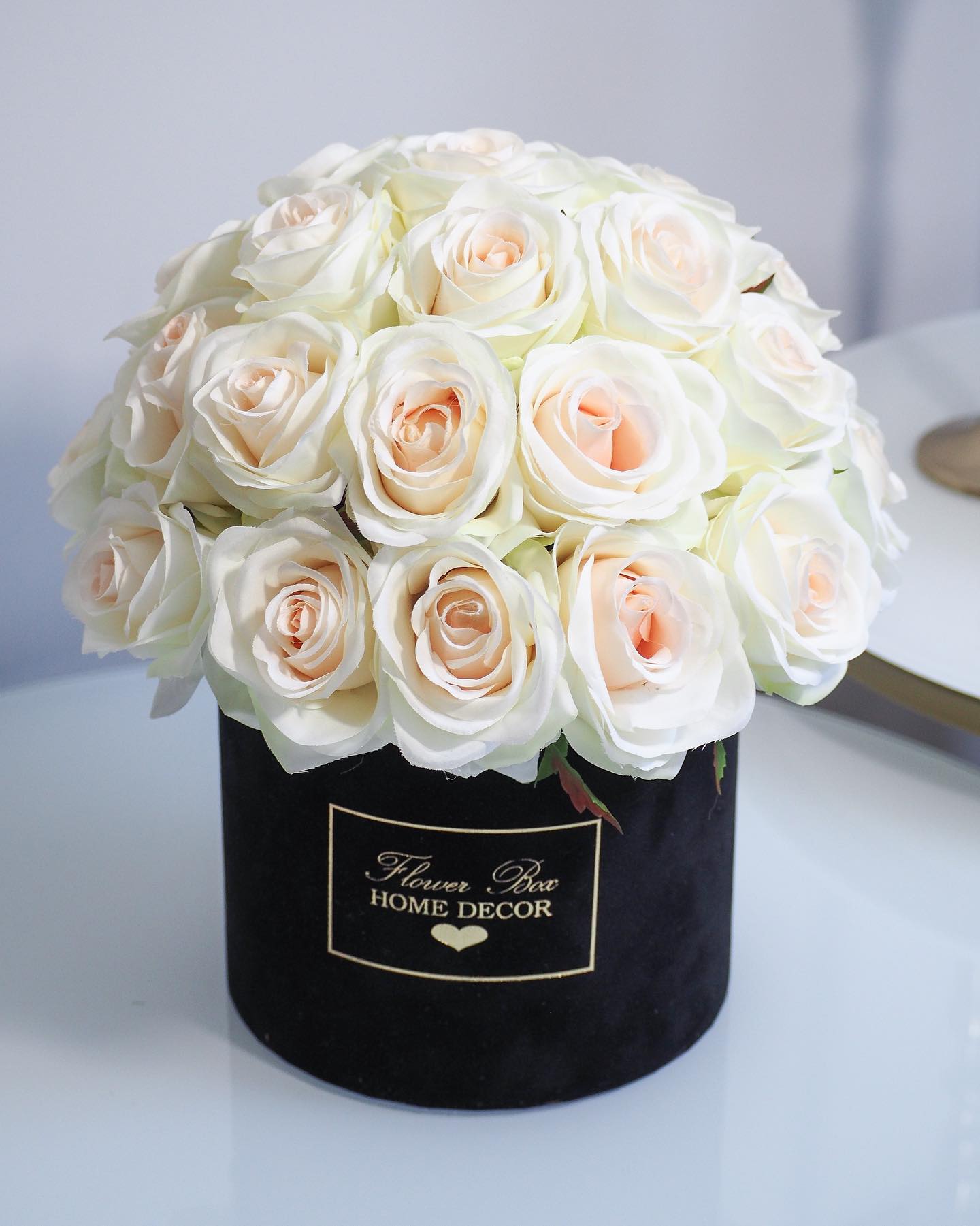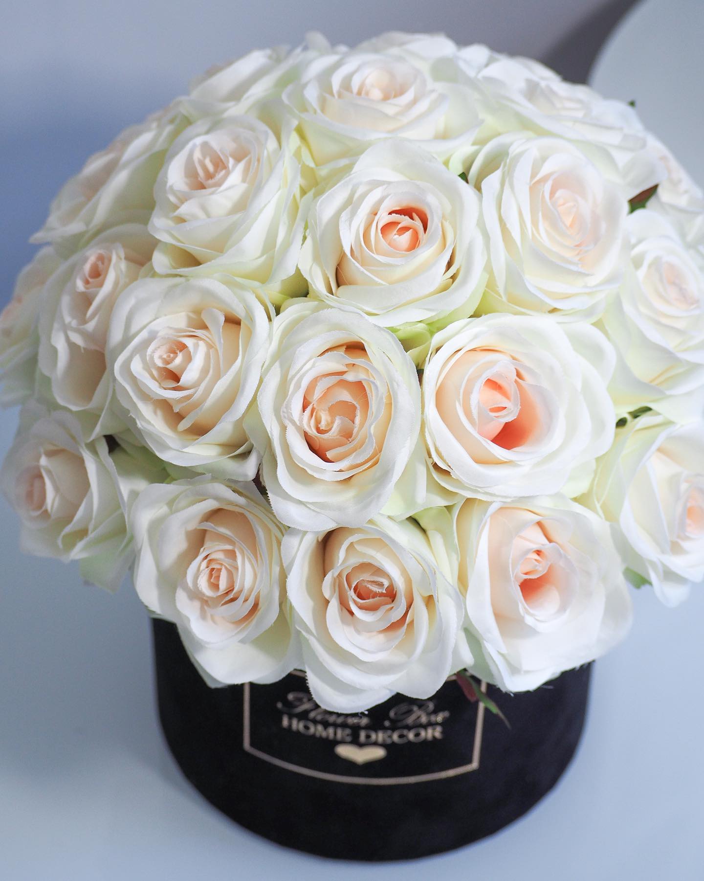 Flower Box wykonany ręcznie z dbałością o każdy szczegół z miękkiego weluru z pięknie wyeksponowanym logo Flower Box Home Decor, rozmiar pudełka 18 cm średnicy - 17 cm wysokości.