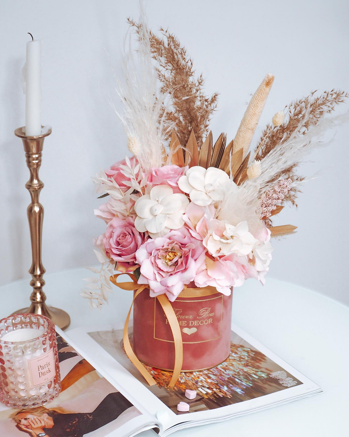 Flower Box wykonany ręcznie z dbałością o każdy szczegół z miękkiego weluru z pięknie wyeksponowanym logo Flower Box Home Decor.
