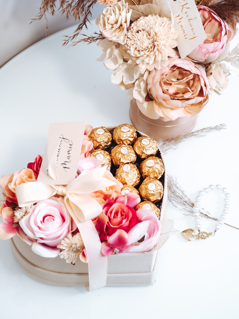 Flower Box w kształcie serca kremowe welurowe z pralinami Ferrero Rocher.