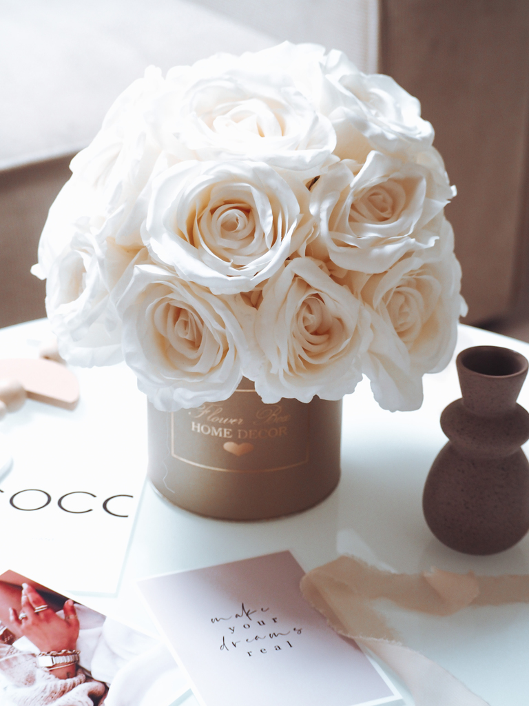 Flower Box wykonany ręcznie z dbałością o każdy szczegół z miękkiego weluru z pięknie wyeksponowanym logo Flower Box Home Decor, rozmiar pudełka 12 cm średnicy - 13 cm wysokości.