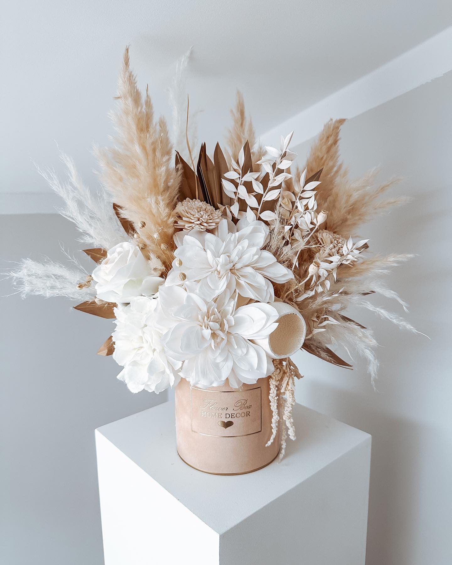 Flower Box wykonany ręcznie z dbałością o każdy szczegół z pięknie wyeksponowanym logo Flower Box Home Decor.