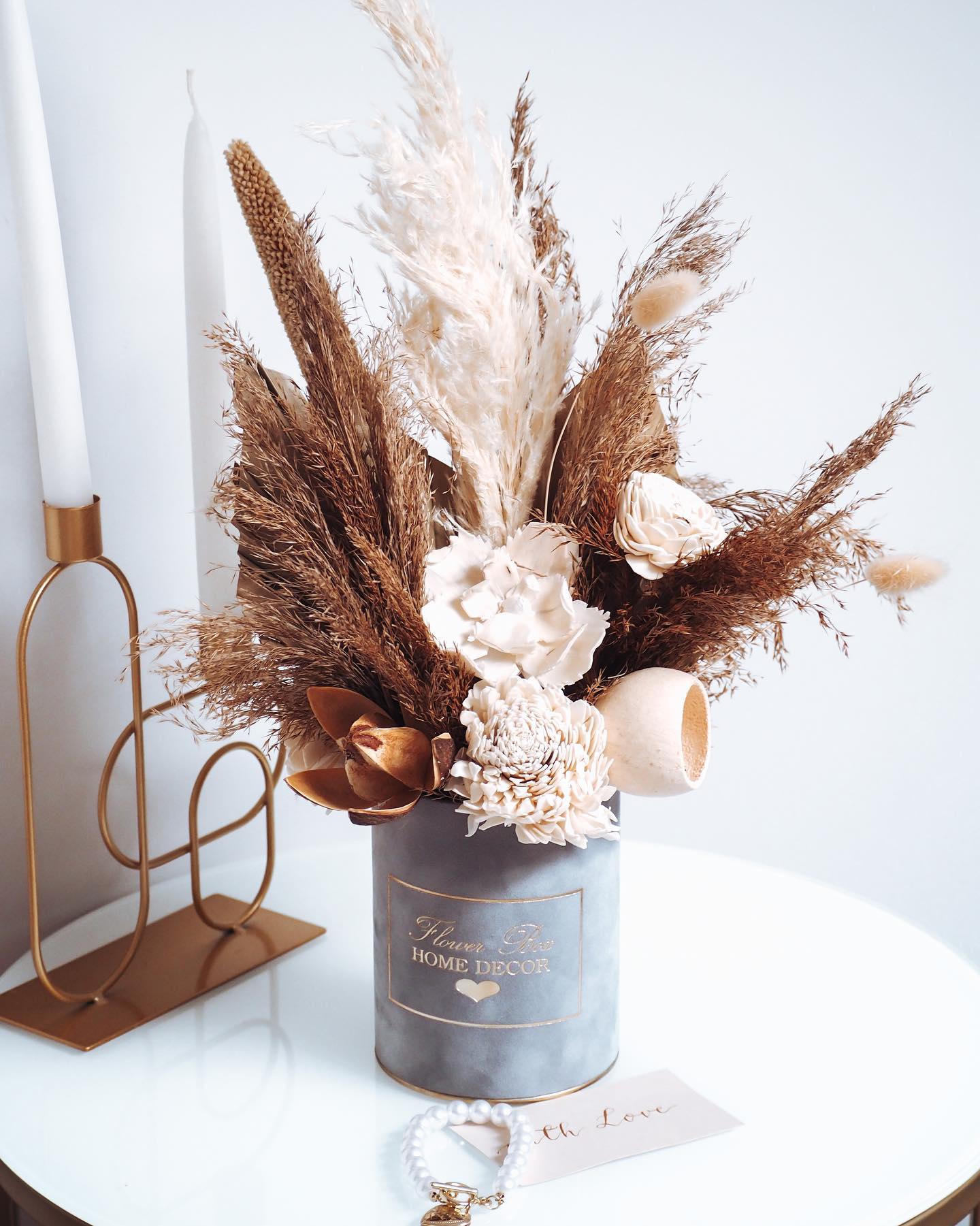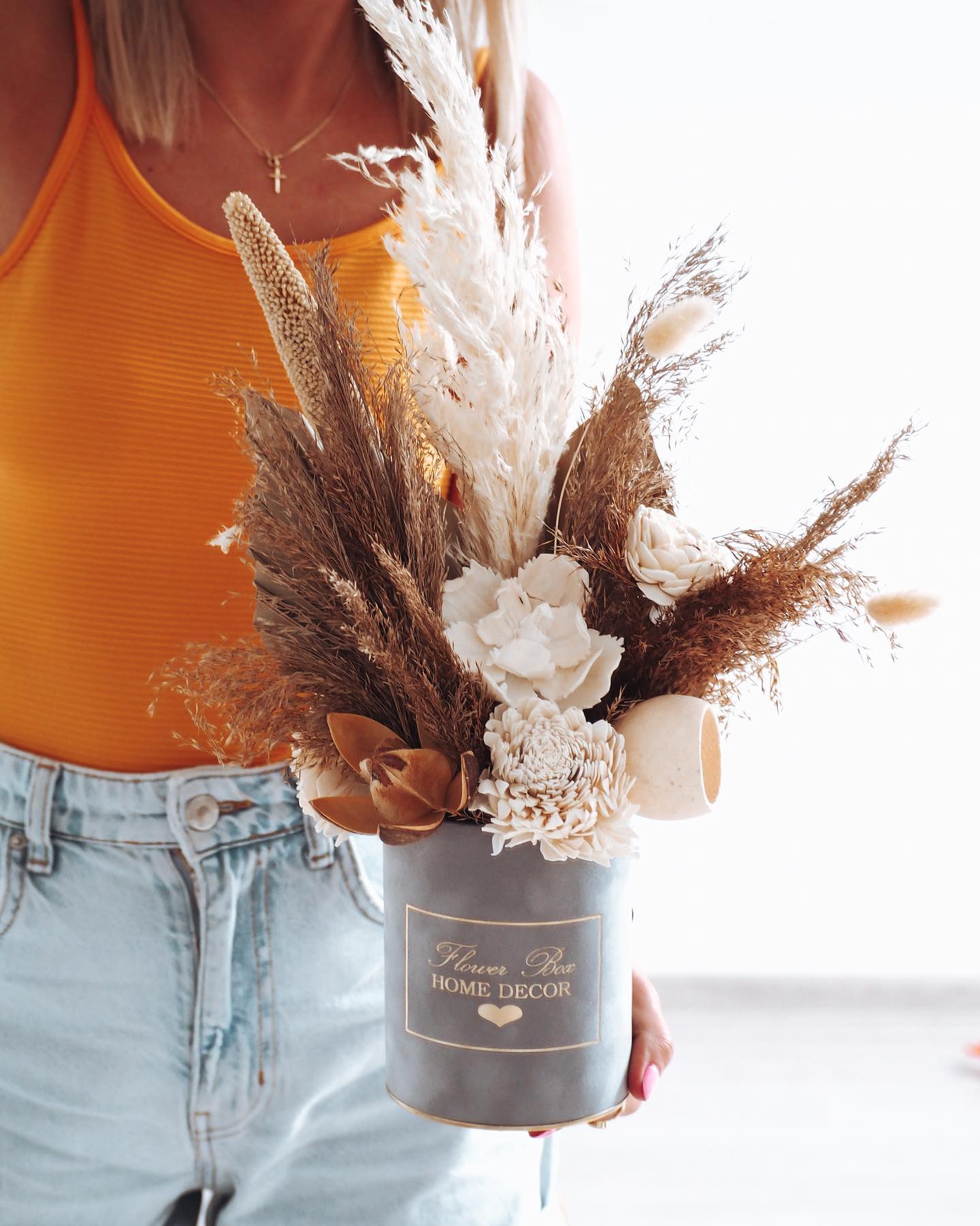 Flower Box wykonany ręcznie z dbałością o każdy szczegół z miękkiego weluru z pięknie wyeksponowanym logo Flower Box Home Decor, rozmiar pudełka 10 cm średnicy - 13 cm wysokości.