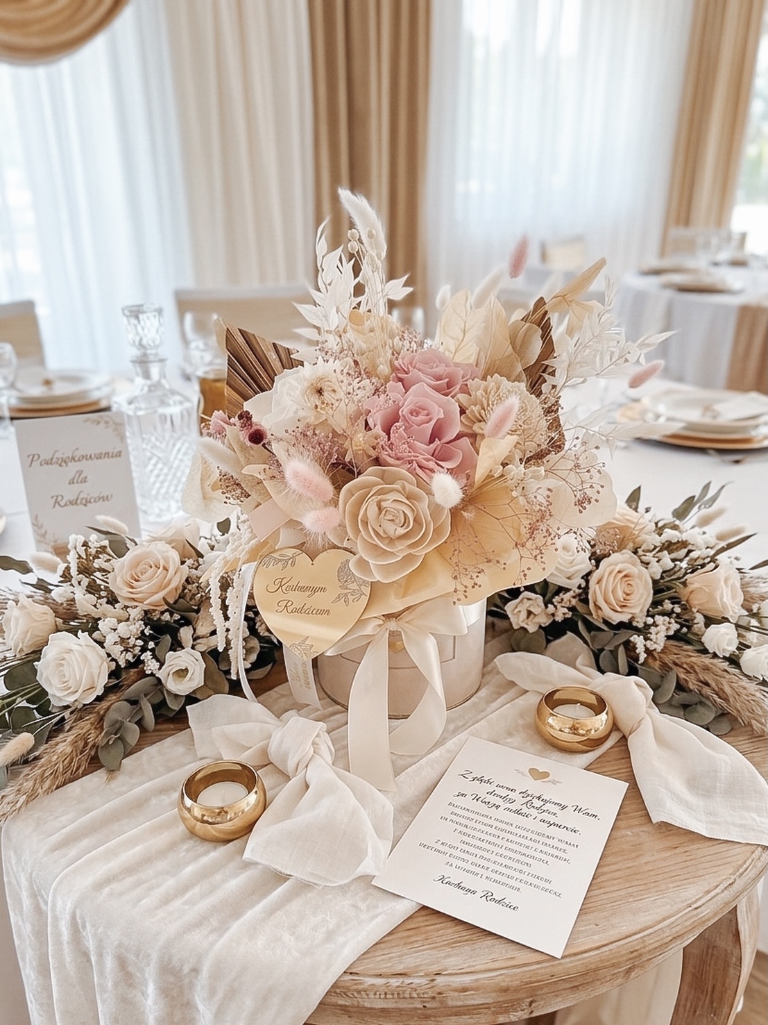 To gotowa kompozycja dekoracyjna, która łączy w sobie trwałość wiecznych kwiatów z luksusowymi dodatkami.