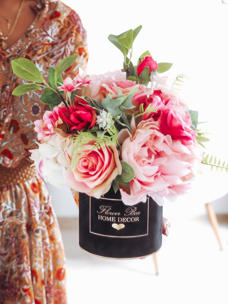 Flower Box wykonany ręcznie z dbałością o każdy szczegół z miękkiego weluru z pięknie wyeksponowanym logo Flower Box Home Decor, rozmiar pudełka 12 cm średnicy - 13 cm wysokości.