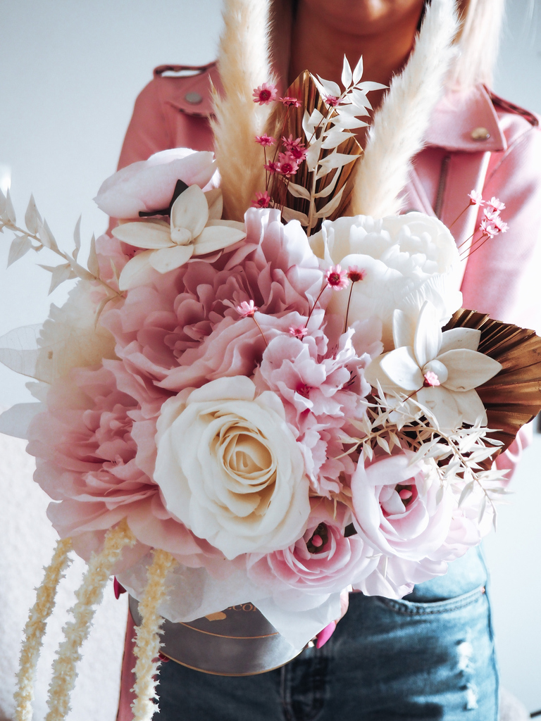 Kompozycja z najwyższej jakości kwiatów sztucznych, róż, piwoni oraz suszonych dodatków i preperowanego ruskusu.
