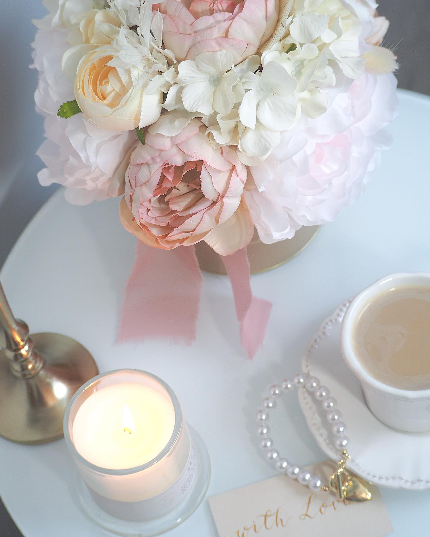 Kwiaty jedwabne hortensje, piwonie, pełnik w kolorach pudrowych, bardzo kobiece połączenie.