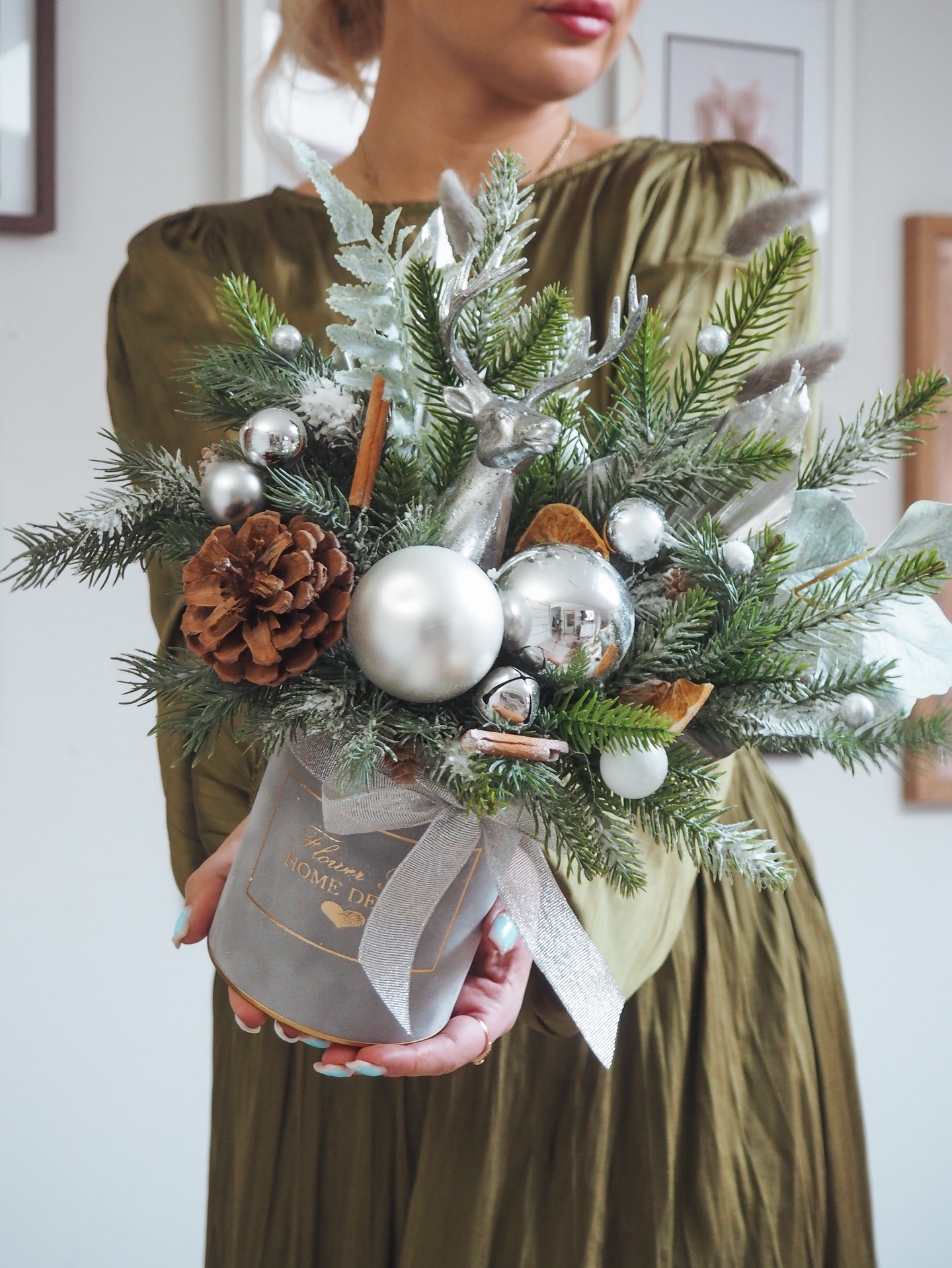 Kompozycja w kolorach zieleni, srebra i bieli. Naturalne cytrusy i cynamon.