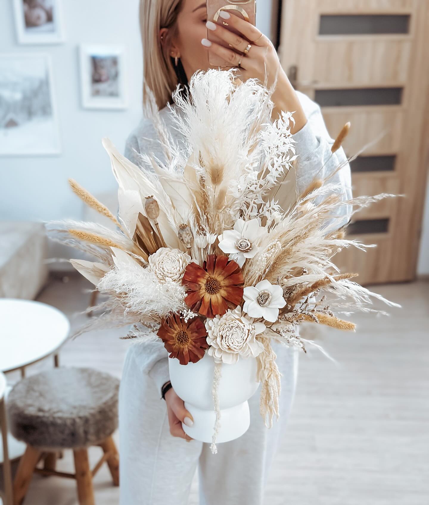 Palmy suszone, trawa pampasowa oraz suszone kwiaty i dodatki.