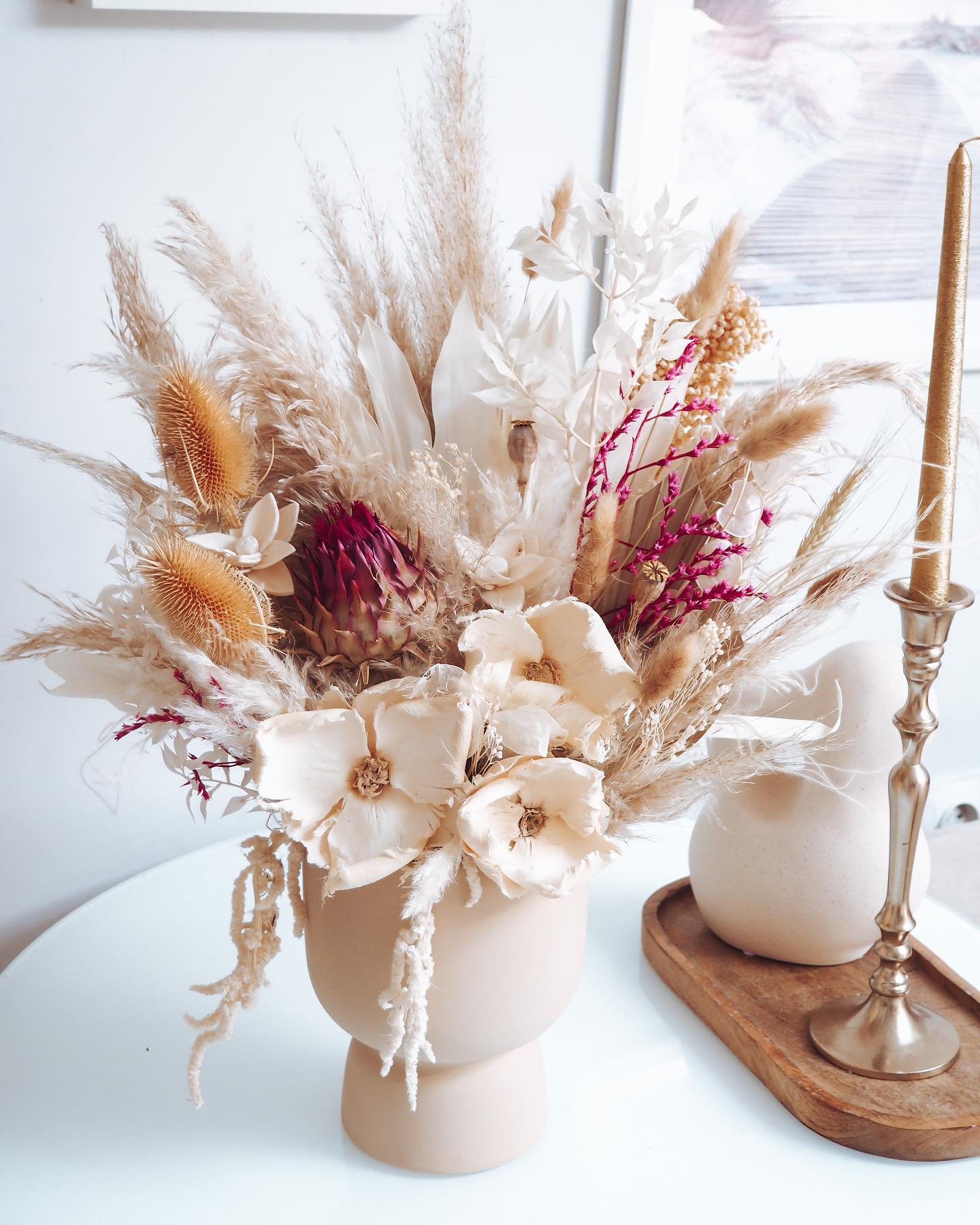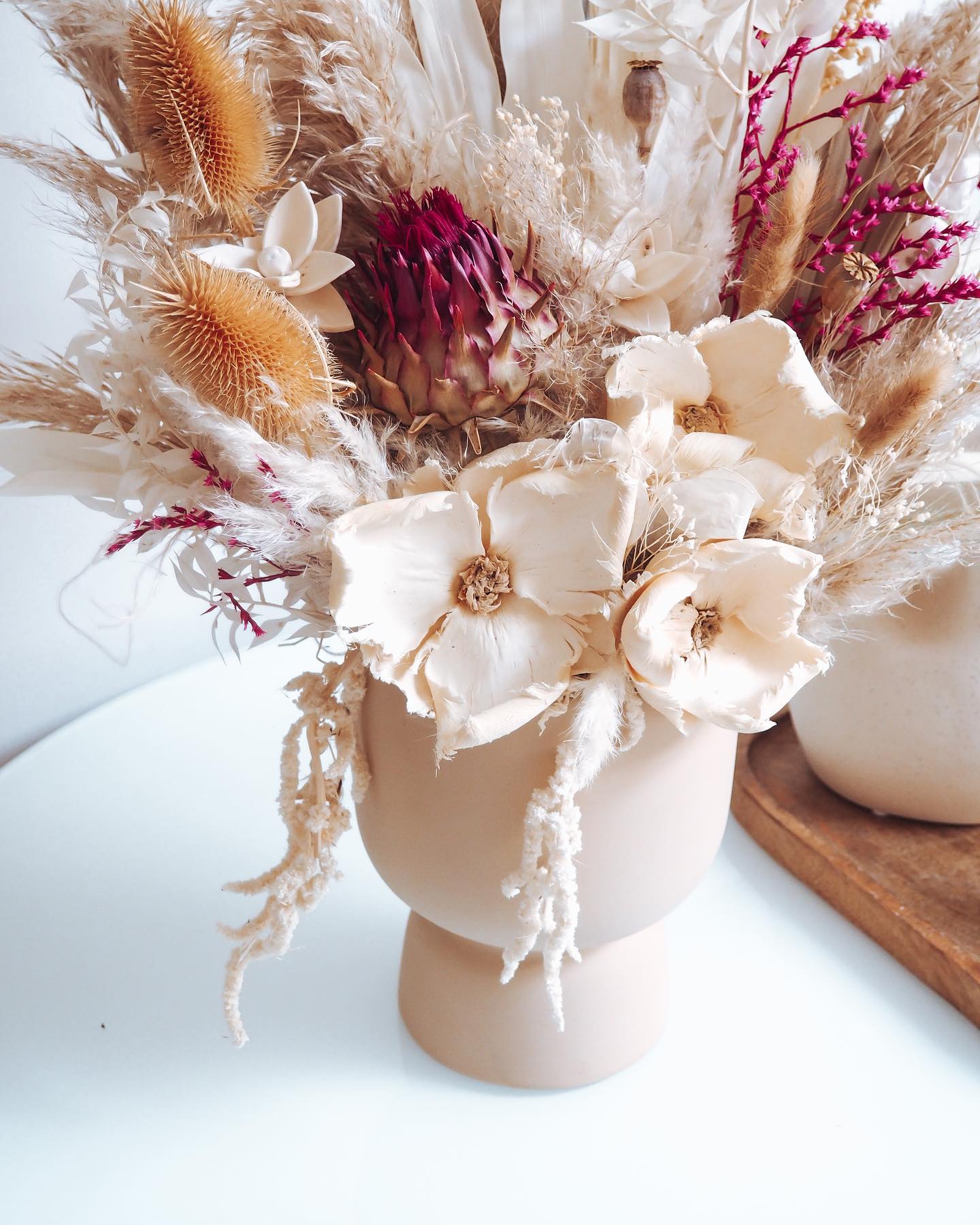Palmy suszone, trawa pampasowa oraz suszone kwiaty i dodatki.