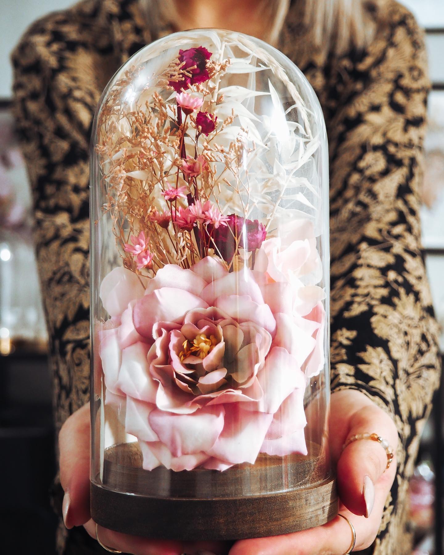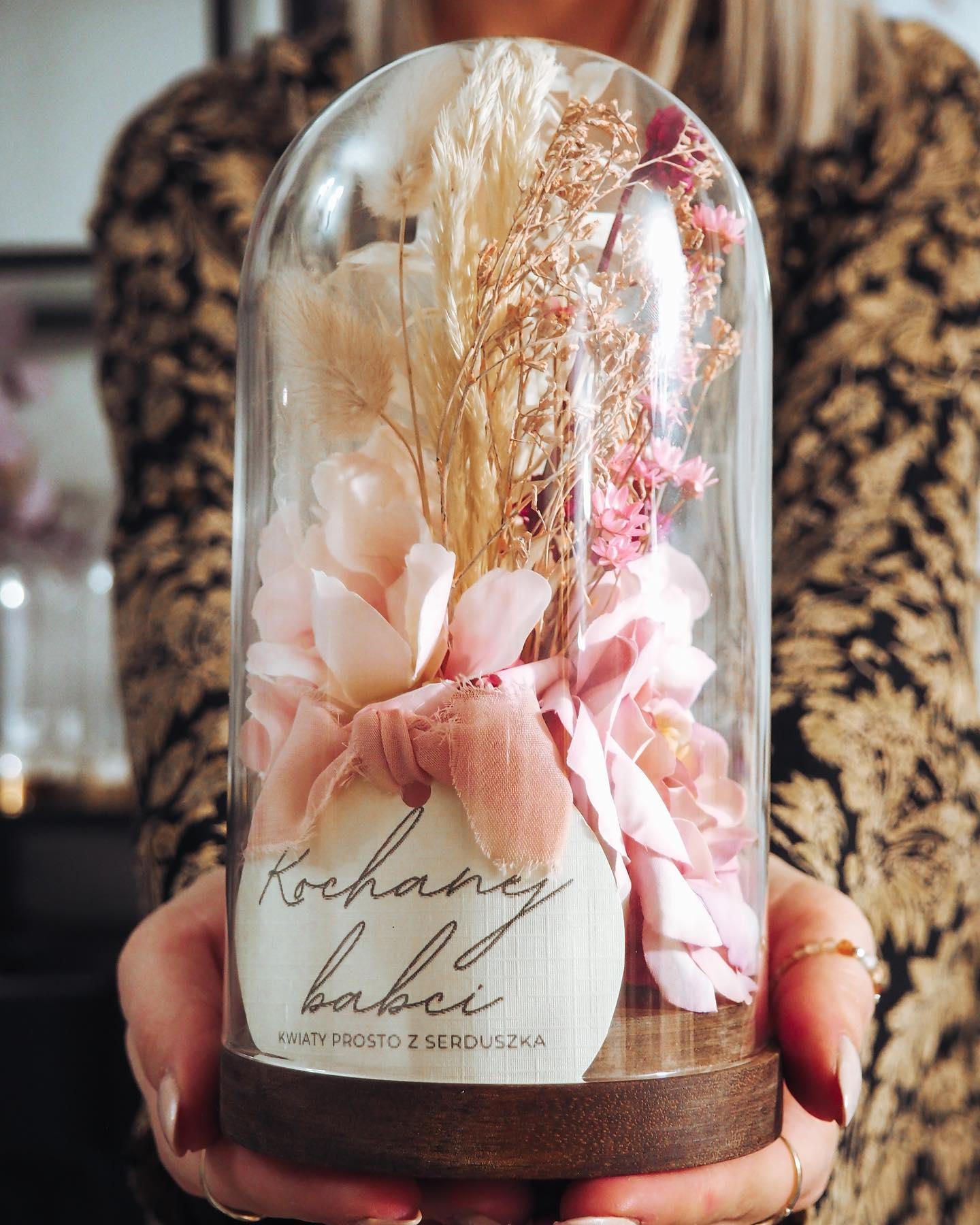 Niesamowita kopuła na podstawie drewnianej, szklana o wysokości 20 cm z bukietem kwiatów.
