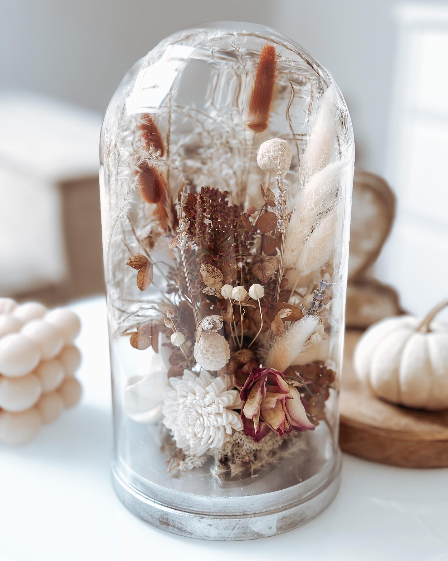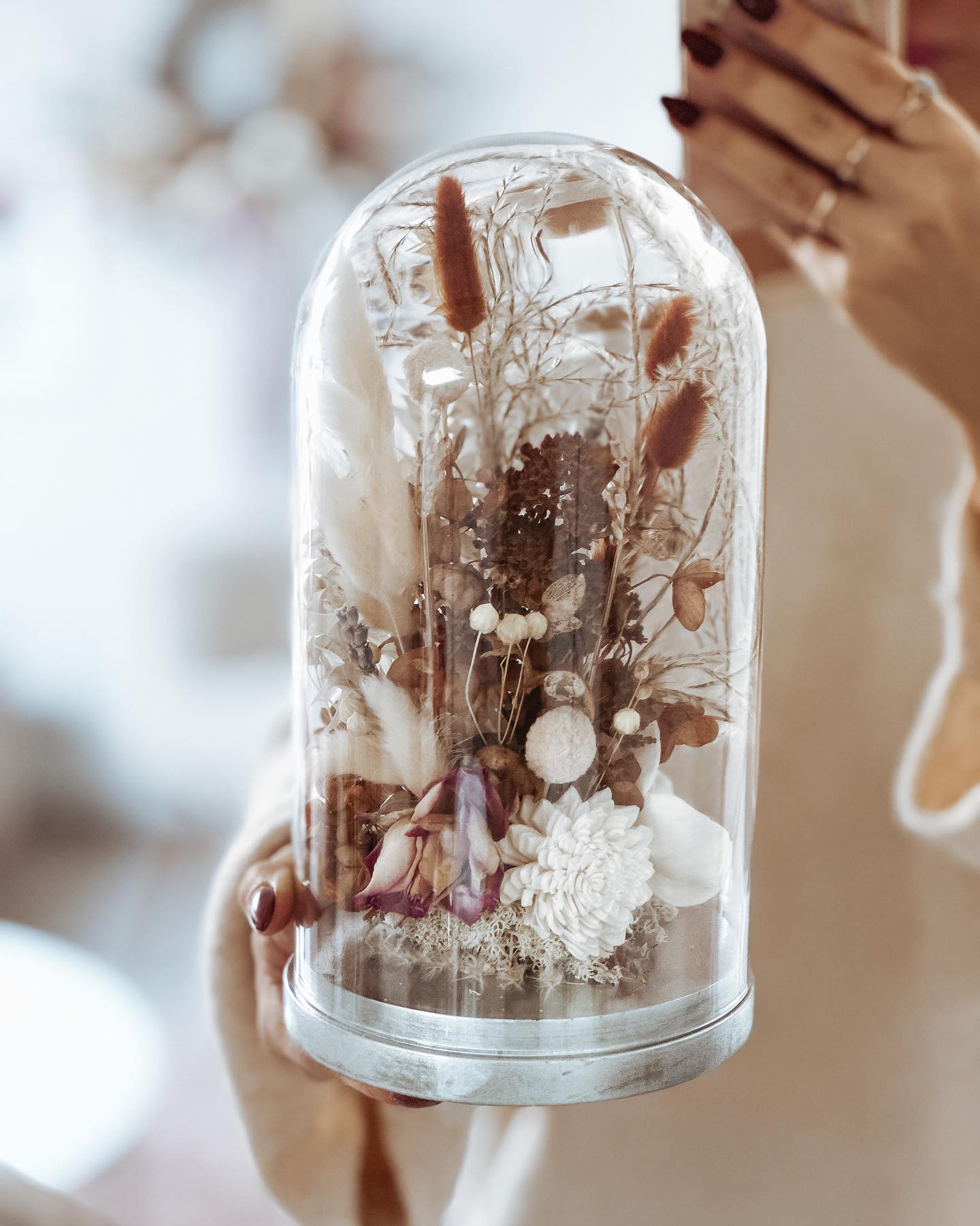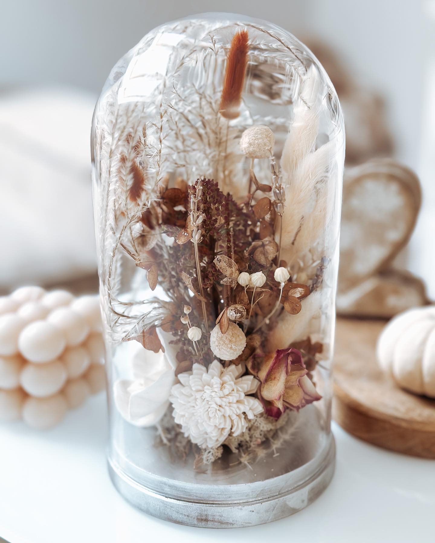 Niesamowita kopuła na podstawie srebrnej (może być złota lub drewno), szklana o wysokości 26 cm z bukietem kwiatów.