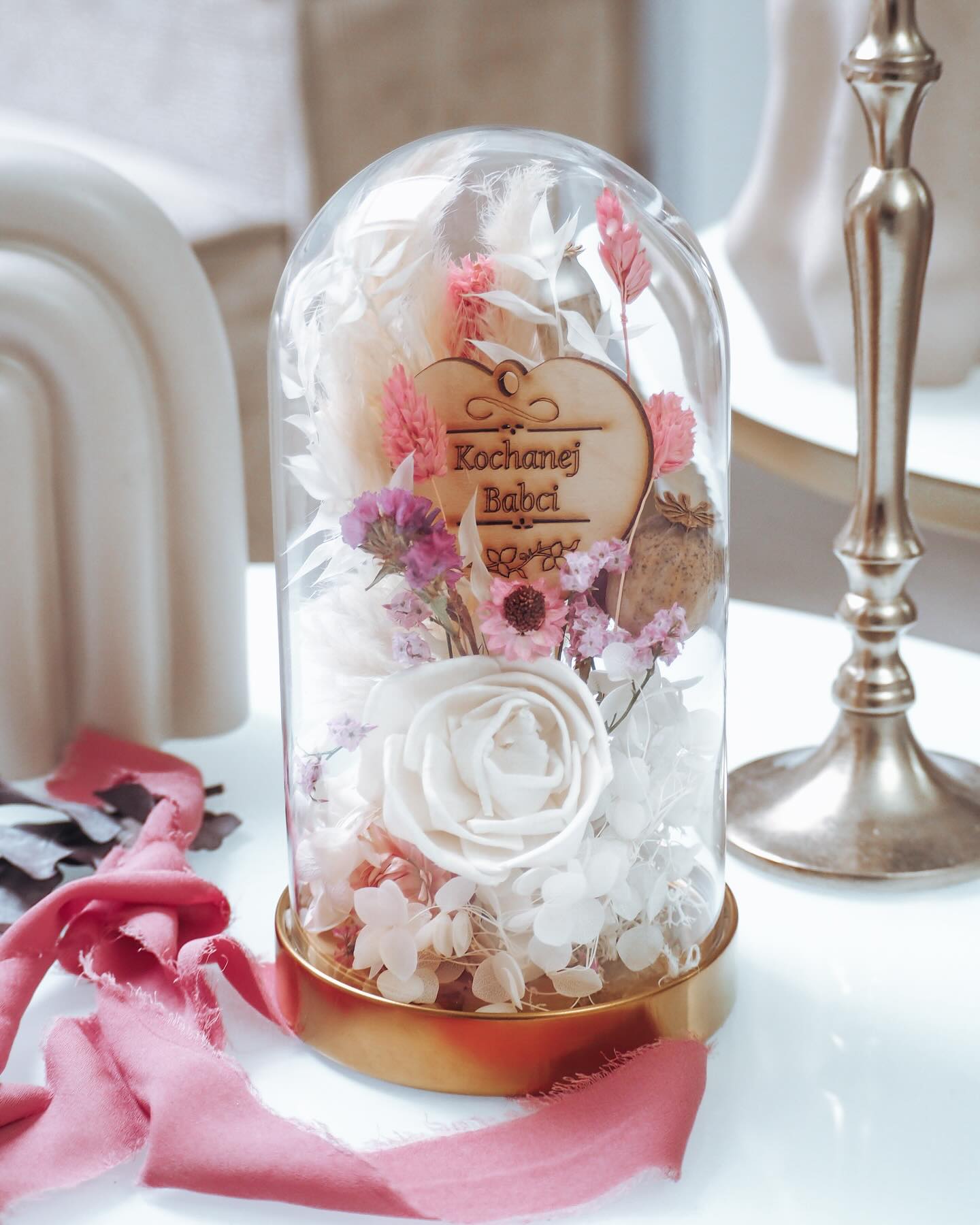 Kopuła na podstawie złotej, szklana o wysokości 20 cm z bukietem kwiatów.
