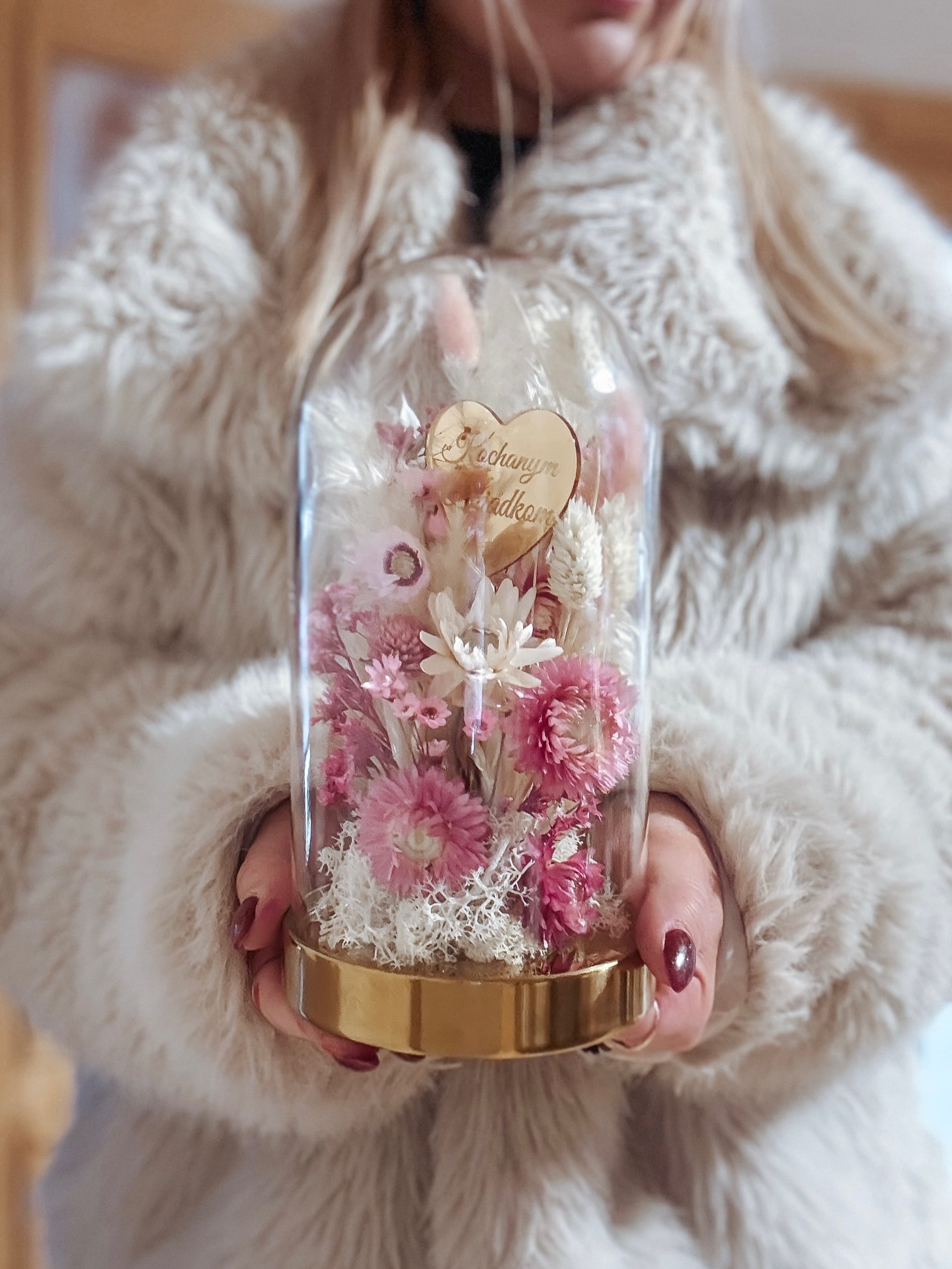 Kopuła na podstawie złotej, szklana o wysokości 20 cm z bukietem kwiatów.