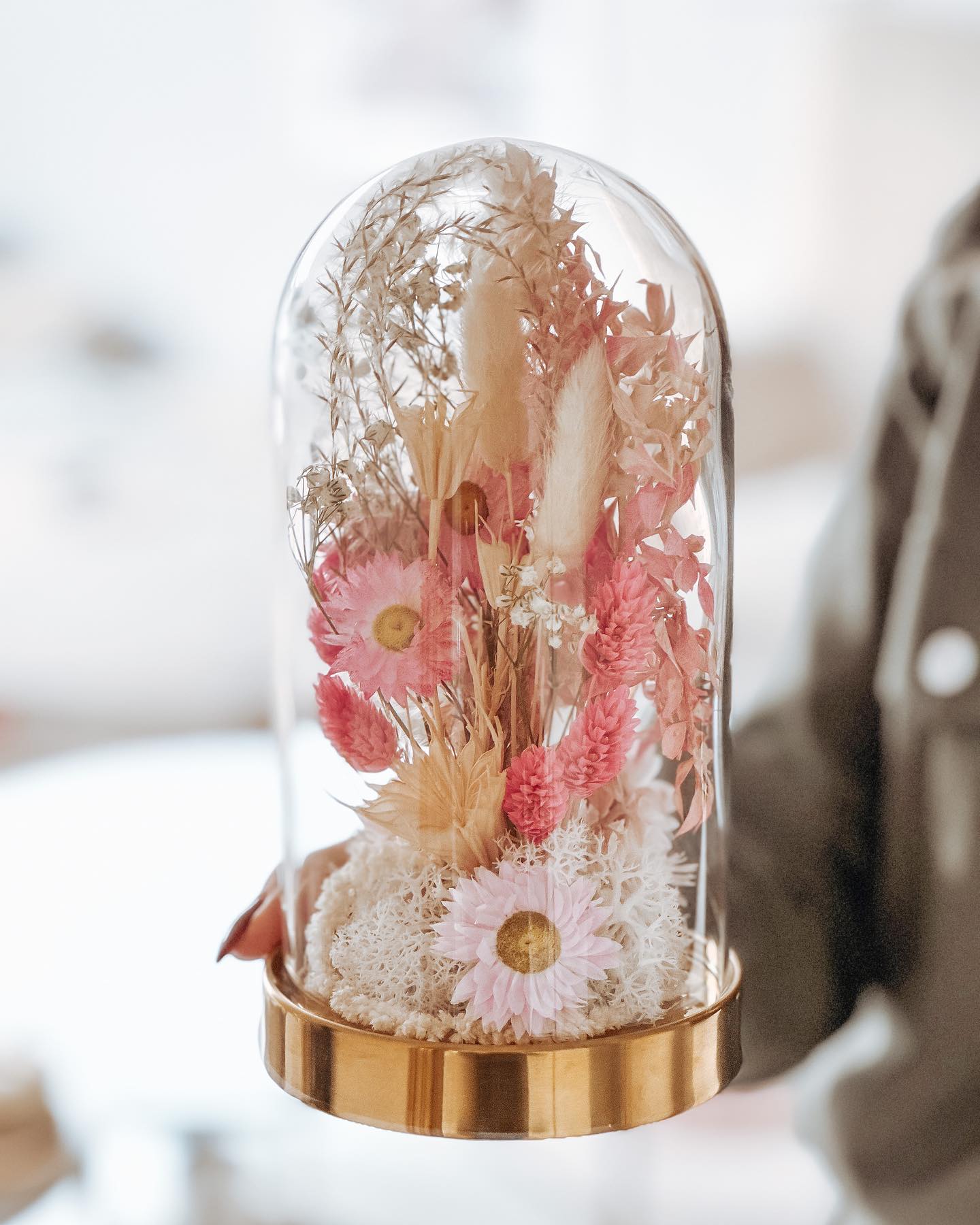 Kopuła na podstawie złotej, szklana o wysokości 20 cm z bukietem kwiatów.