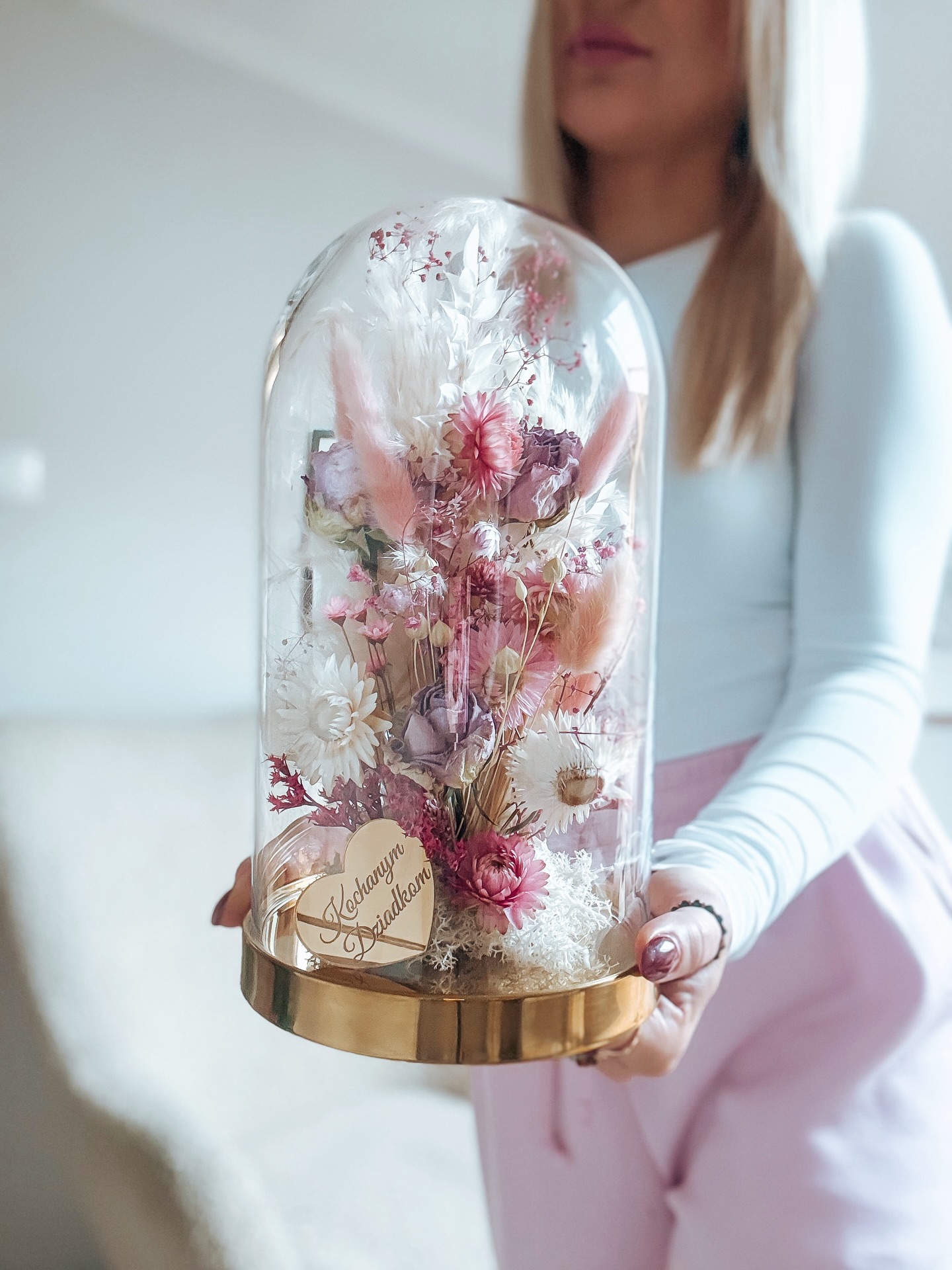 Dodatkiem są suszone kwiaty, trawy pampasowe oraz preparowane rośliny.