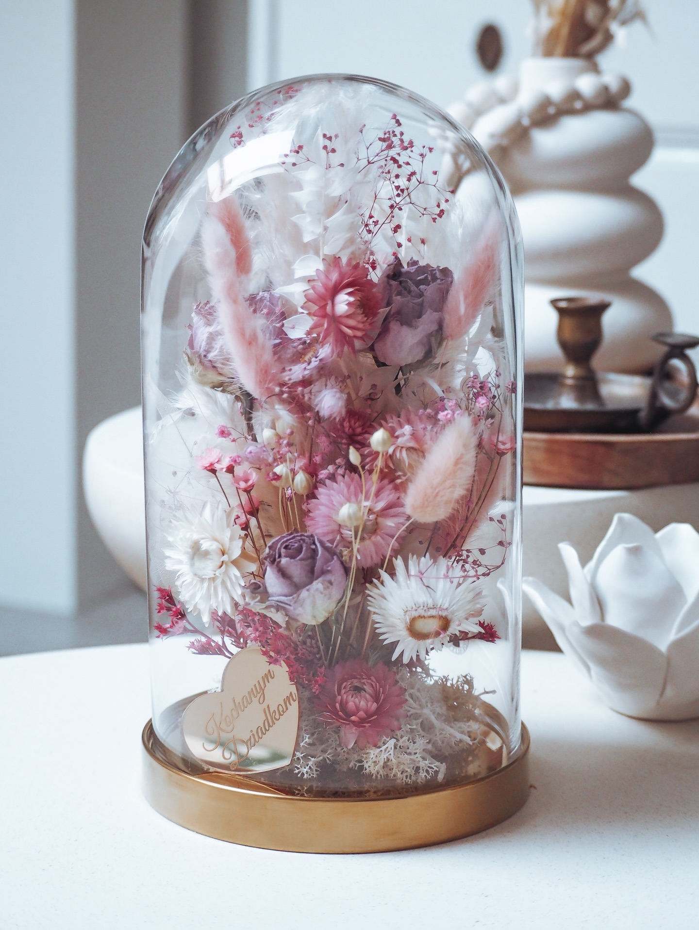 Niesamowita kopuła na podstawie złotej, szklana o wysokości 26 cm z bukietem kwiatów.