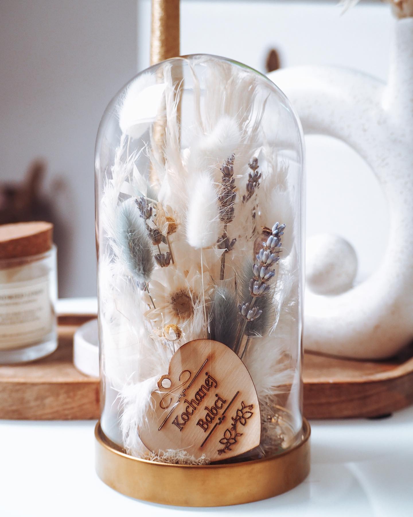 Kopuła na podstawie drewnianej, szklana o wysokości 20 cm z bukietem kwiatów.
