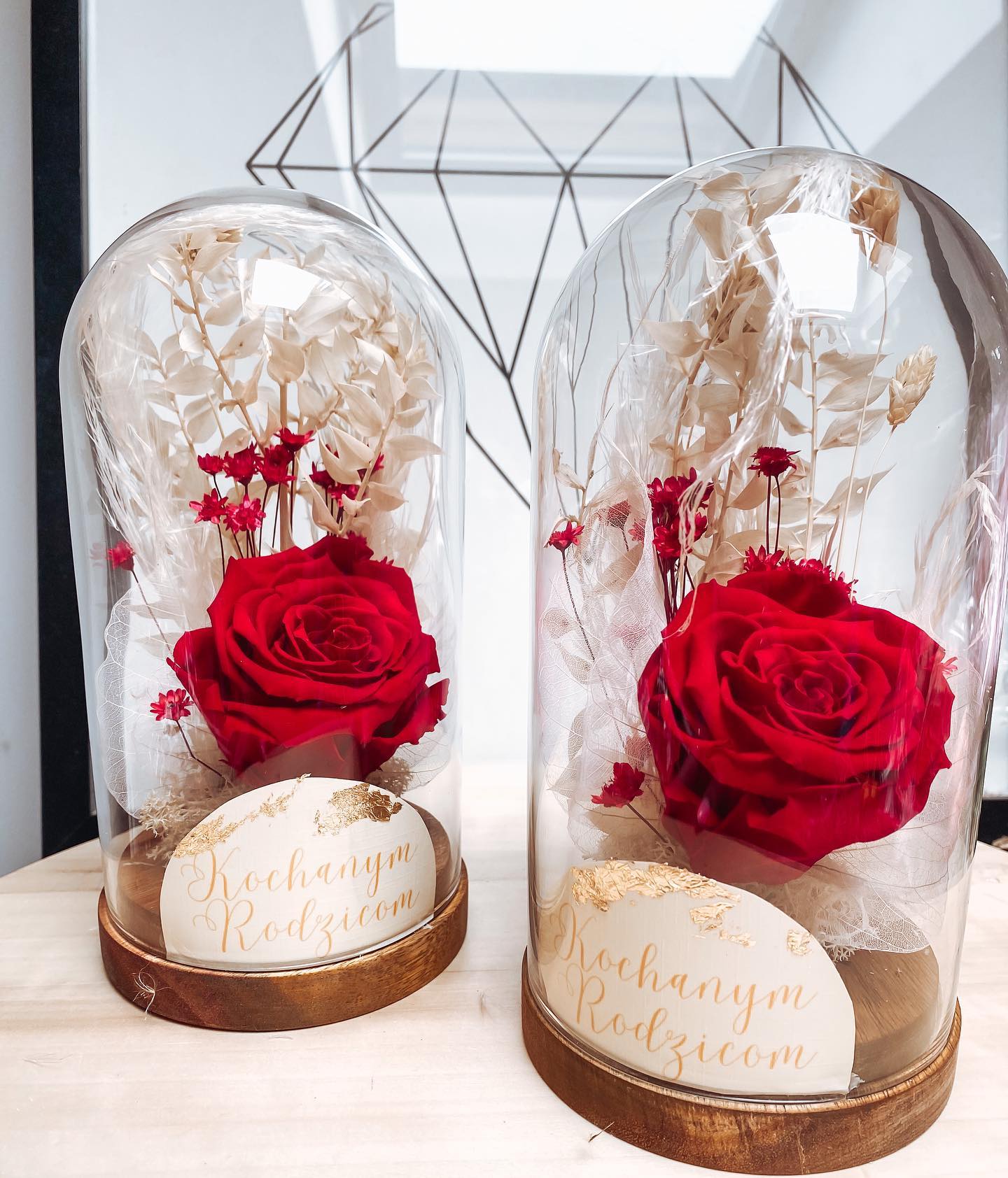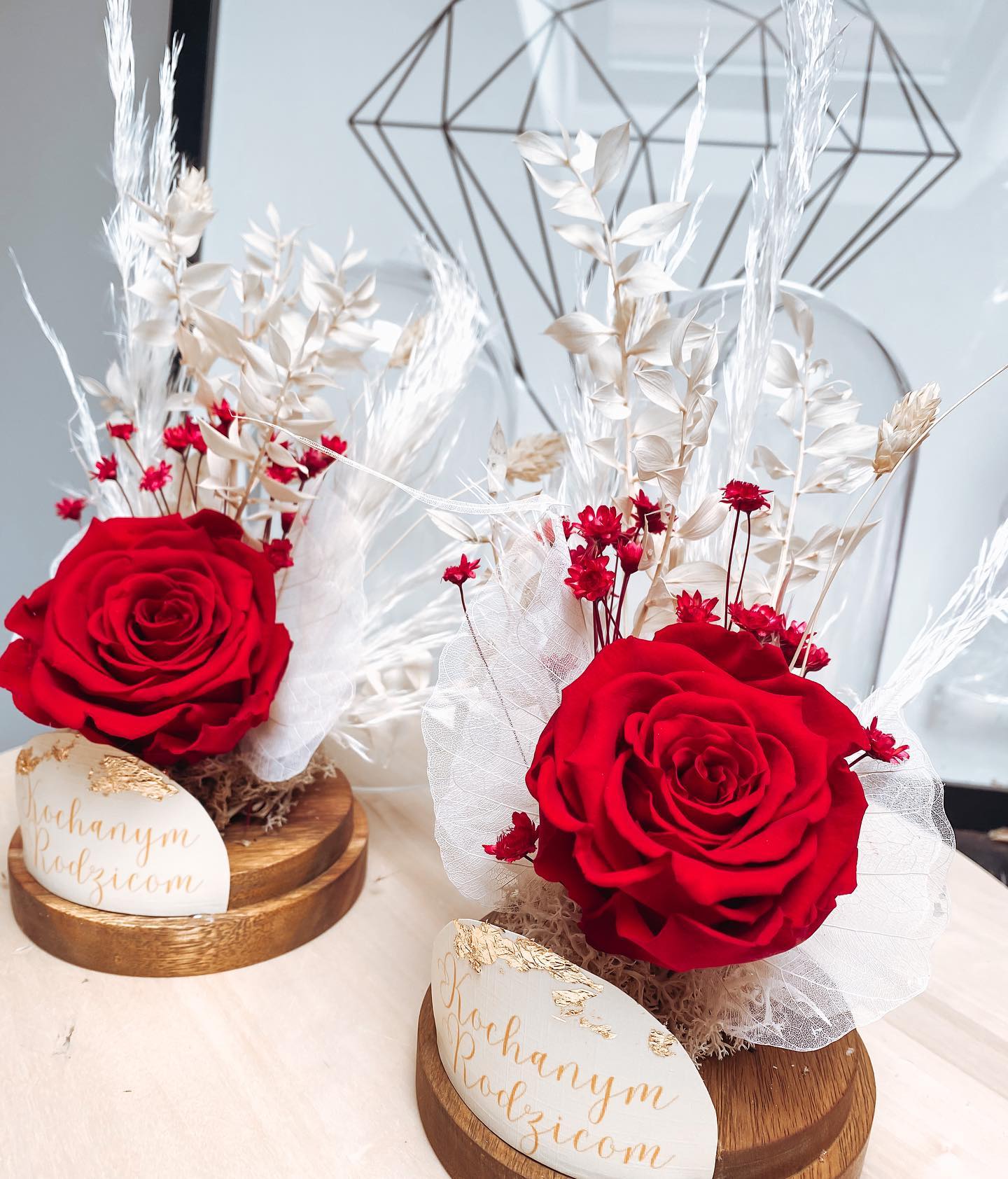 Centrum bukietu stanowi wieczna róża, żywy kwiat poddany procesowi stabilizacji dzięki, któremu utrzymuje swoją świeżość do 2 lat !