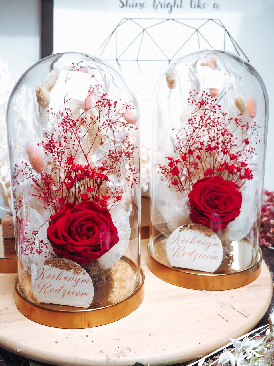 Dodatkiem są suszone kwiaty, trawy pampasowe oraz preparowane rośliny.