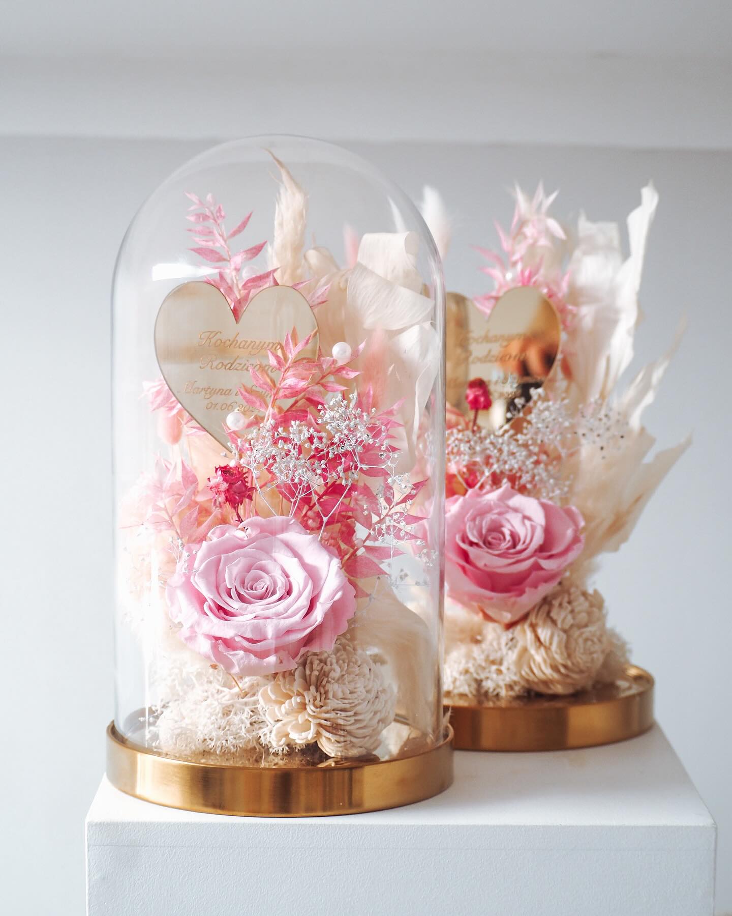 Niesamowita kopuła na podstawie złotej, szklana o wysokości 26 cm z bukietem kwiatów.