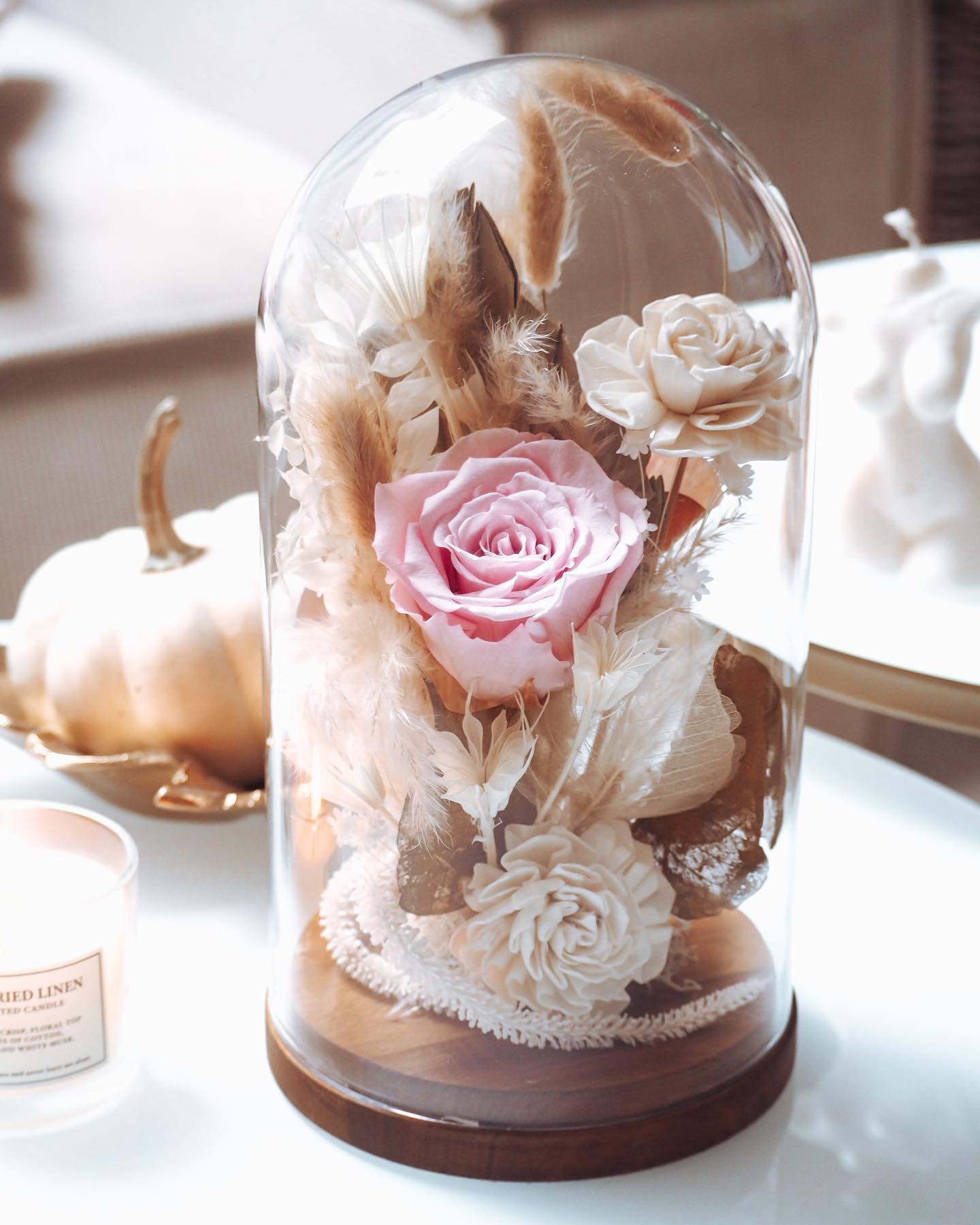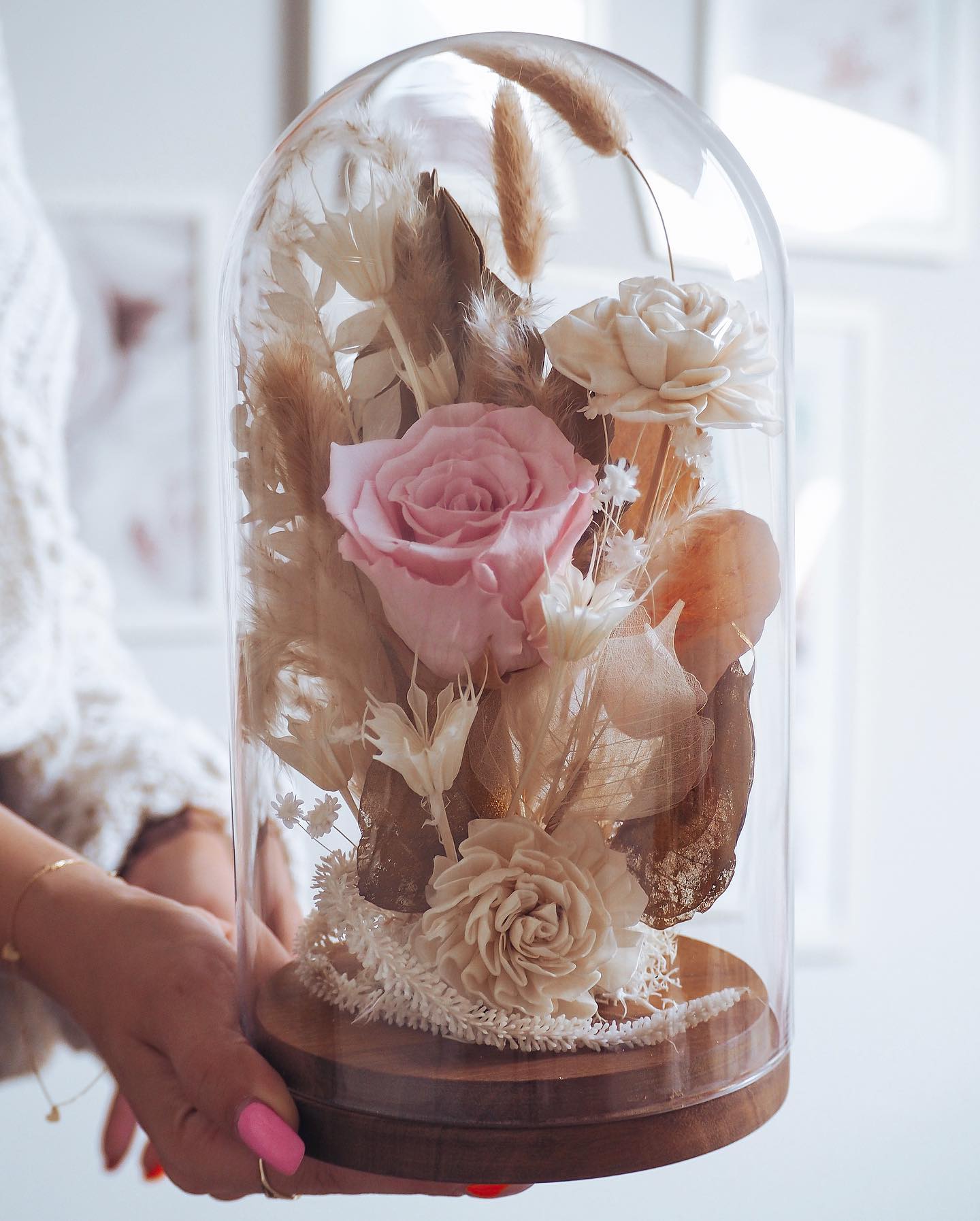 Kopuła na podstawie drewnianej, szklana o wysokości 26 cm z bukietem kwiatów.