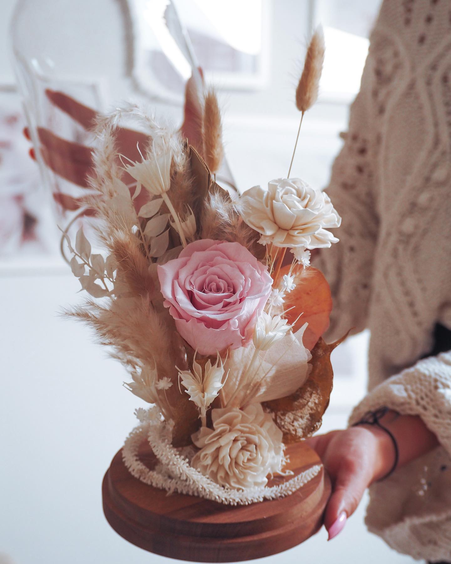 Dodatkiem są suszone kwiaty, trawy pampasowe oraz preparowane rośliny.