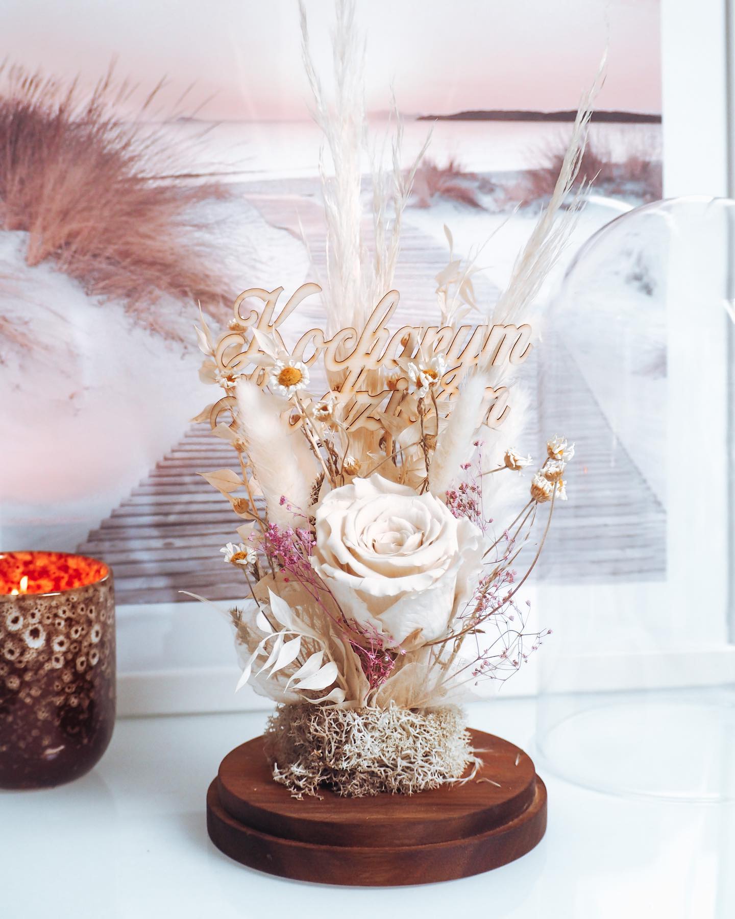 Dodatkiem są suszone kwiaty, trawy pampasowe oraz preparowane rośliny.