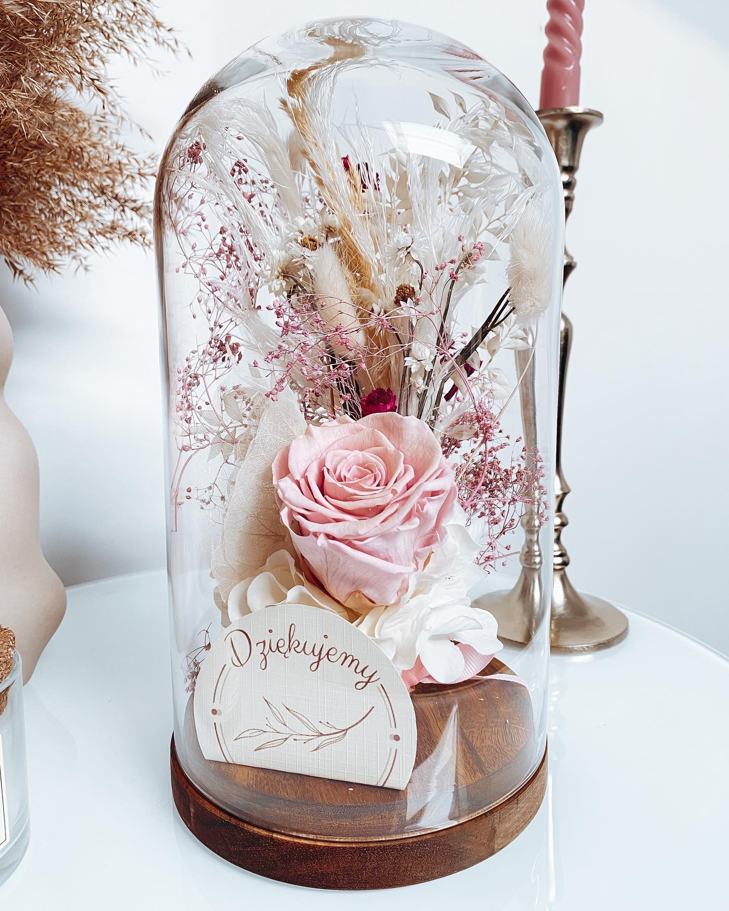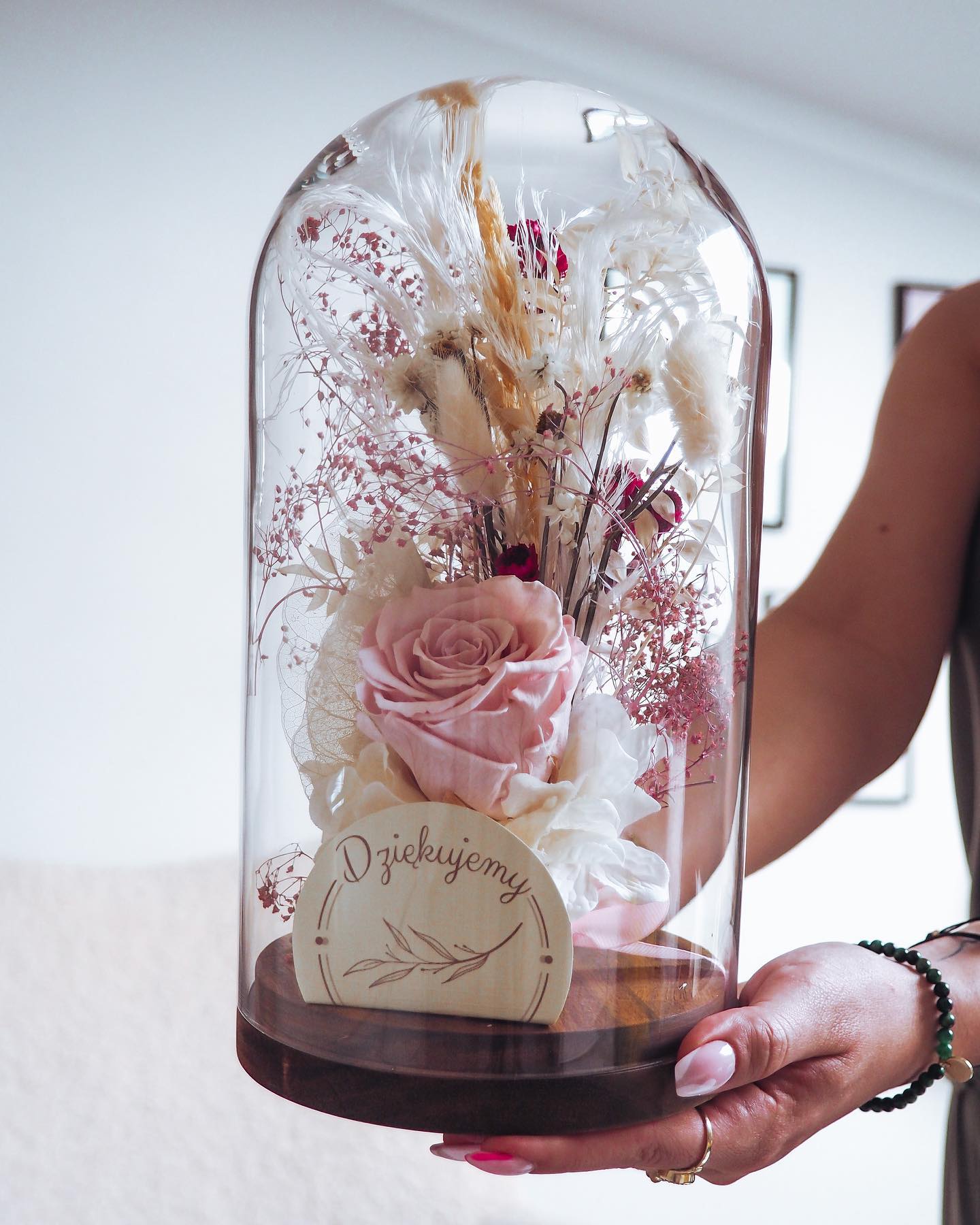 Niesamowita kopuła na podstawie drewnianej, szklana o wysokości 26 cm z bukietem kwiatów.
