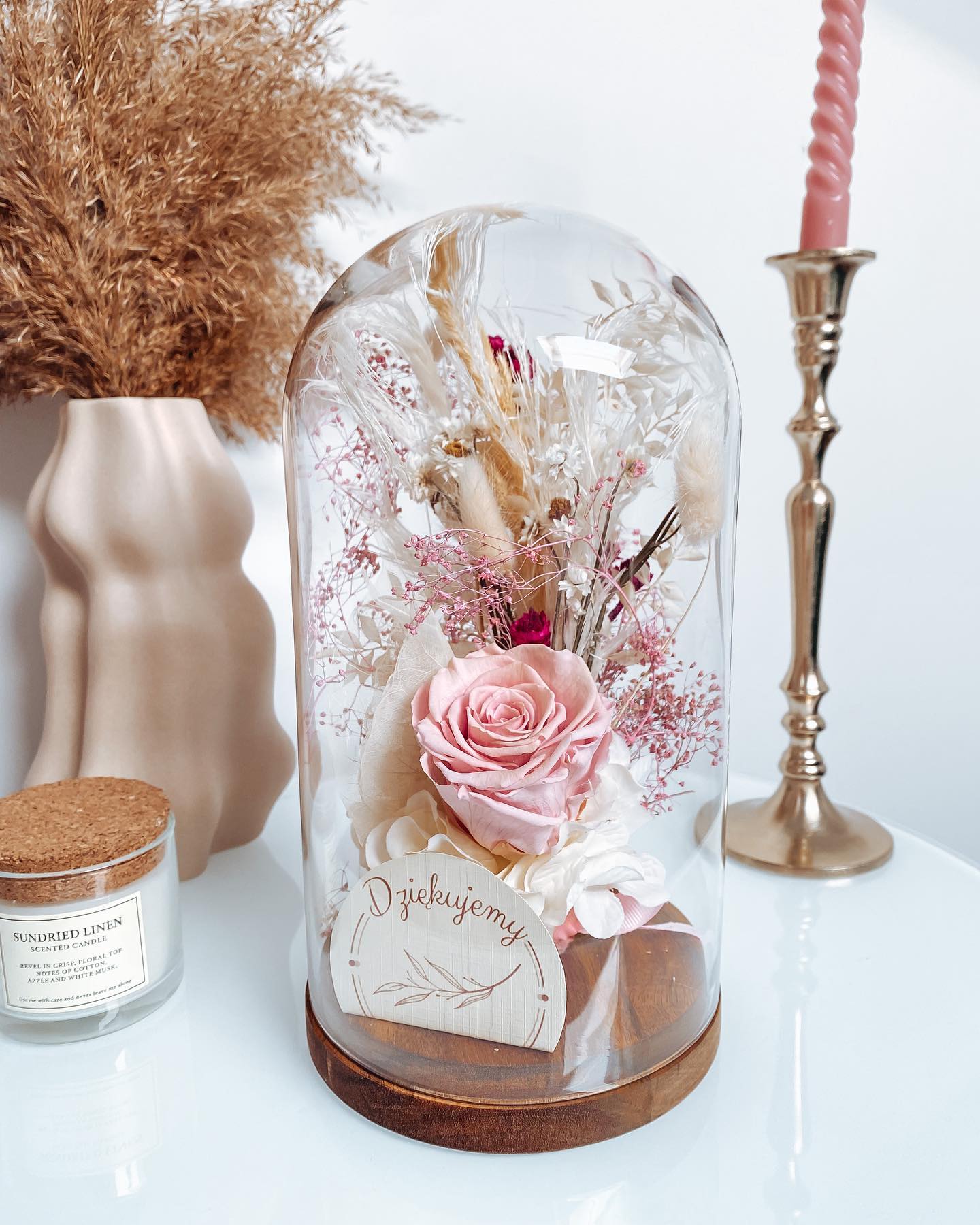 Dodatkiem są suszone kwiaty, trawy pampasowe oraz preparowane rośliny.