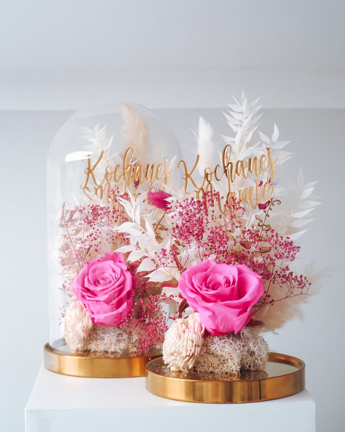 Niesamowita kopuła na podstawie złotej, szklana o wysokości 26 cm z bukietem kwiatów.