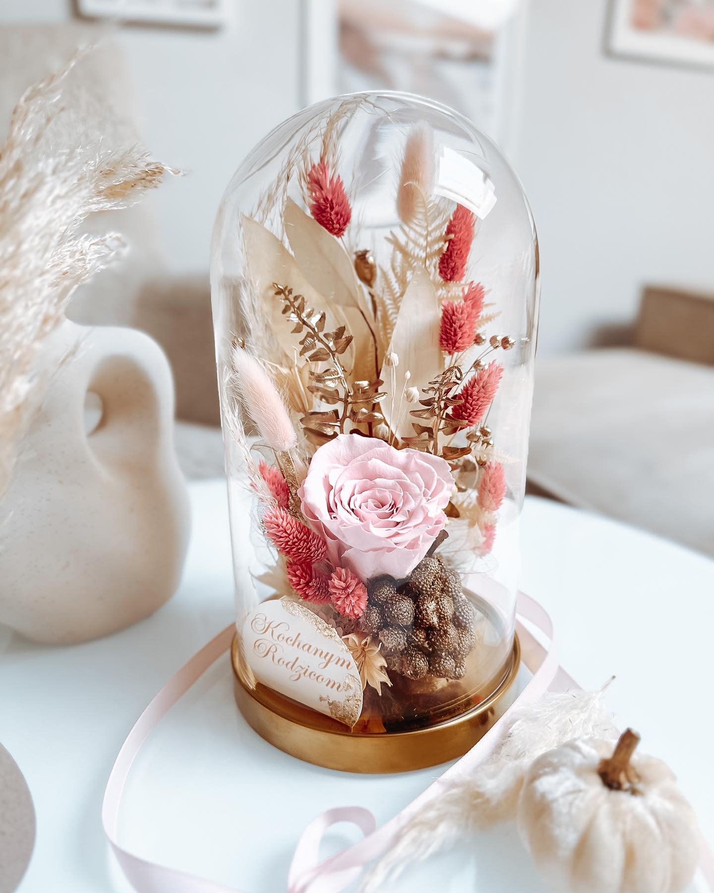 Niesamowita kopuła na podstawie złotej, szklana o wysokości 26 cm z bukietem kwiatów.