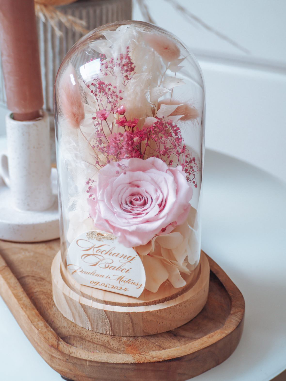 Kopuła na podstawie drewnianej, szklana o wysokości 20 cm z bukietem kwiatów.
